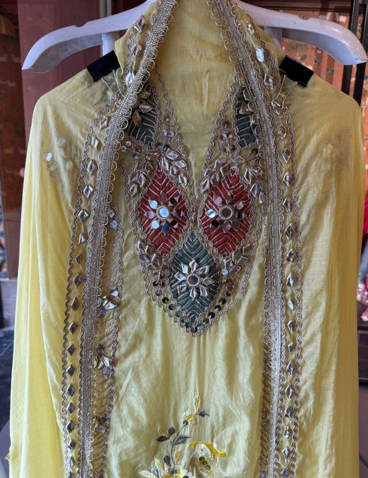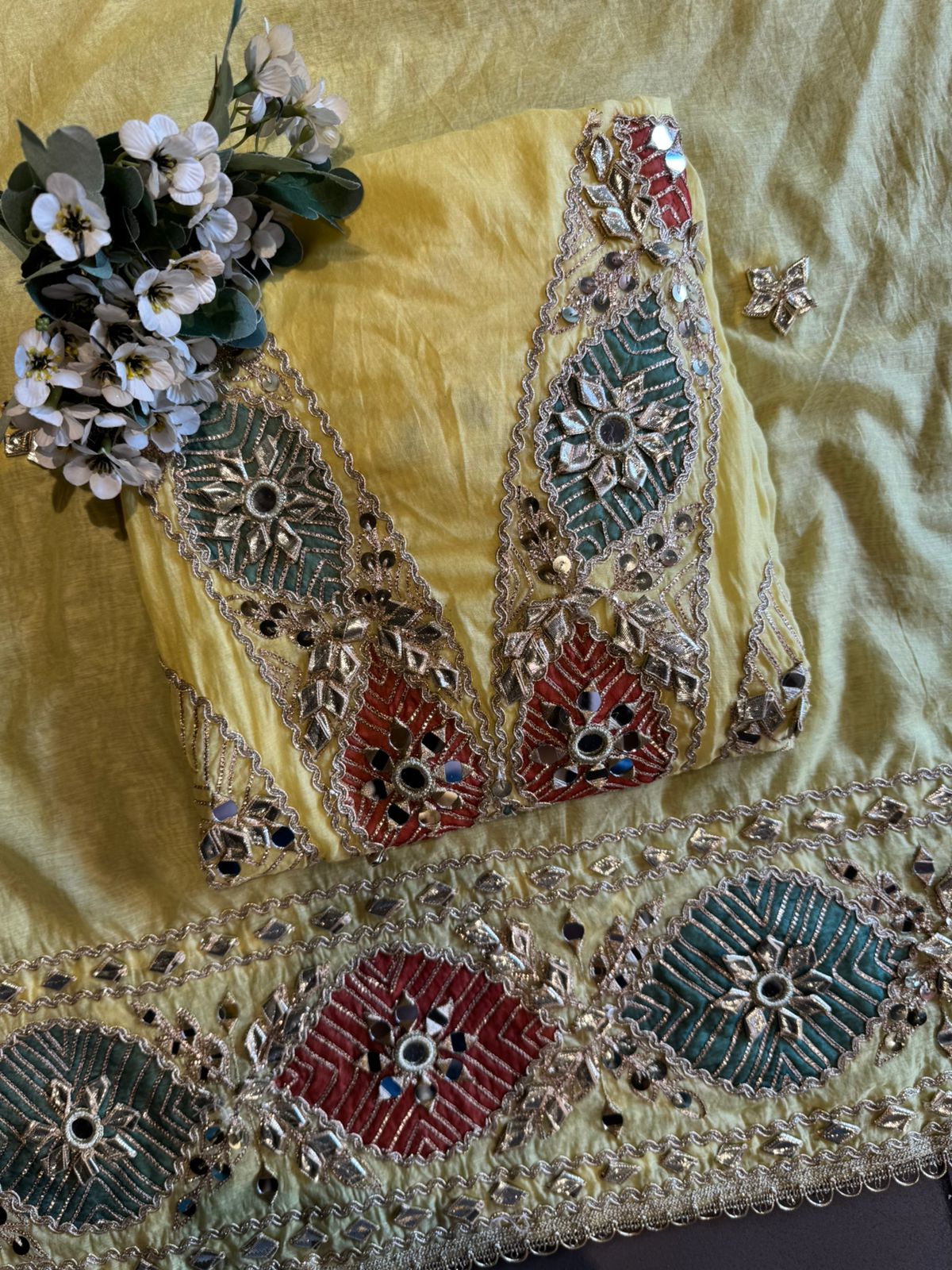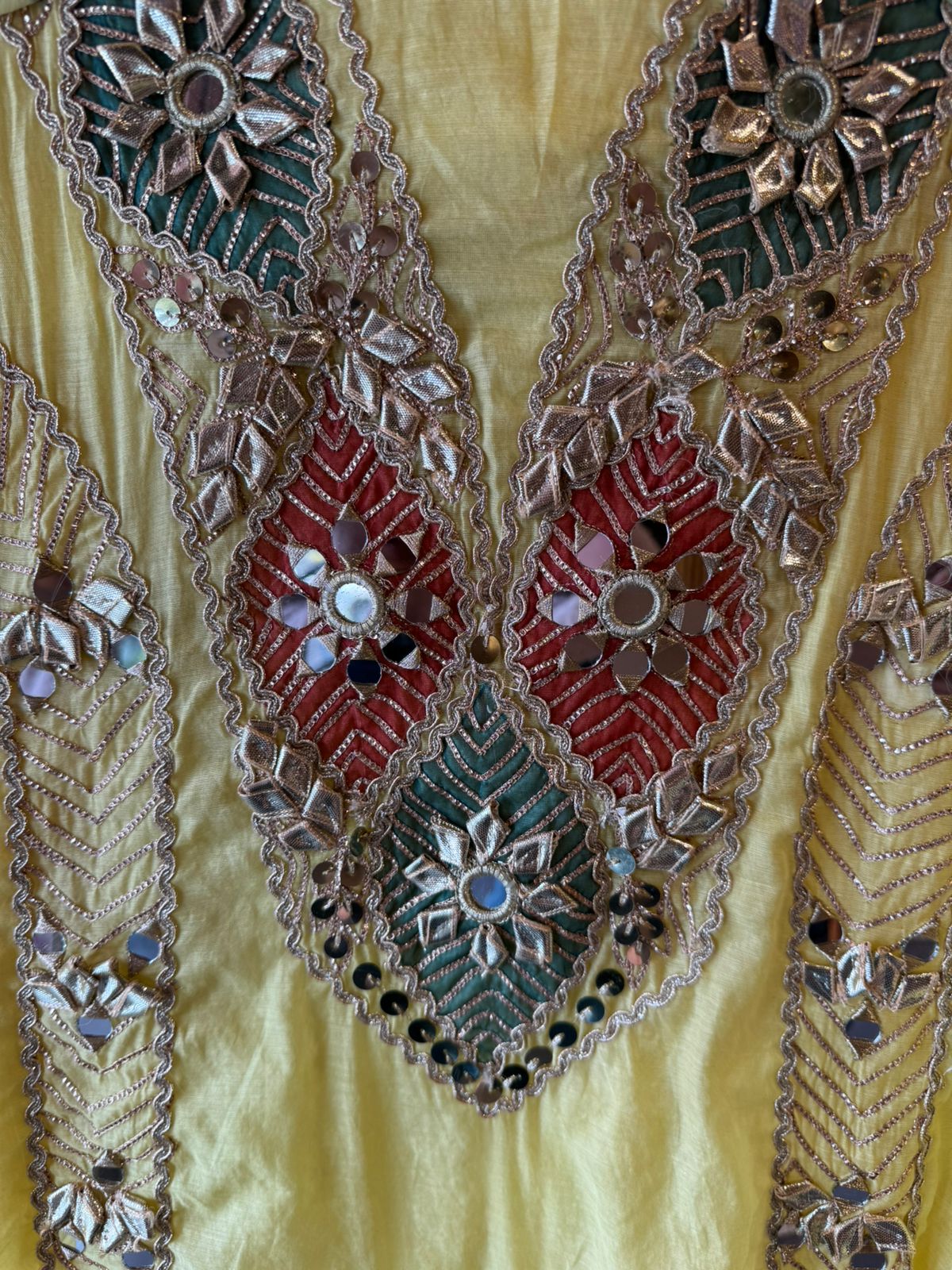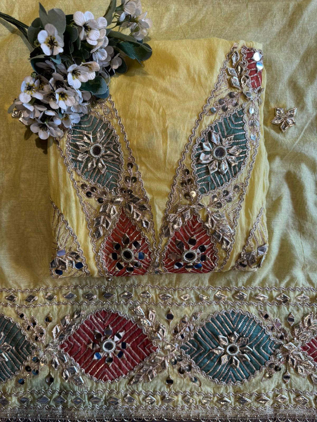 Embedded mirror (shisha) work at motif centers. Outlined with scalloped zari borders.