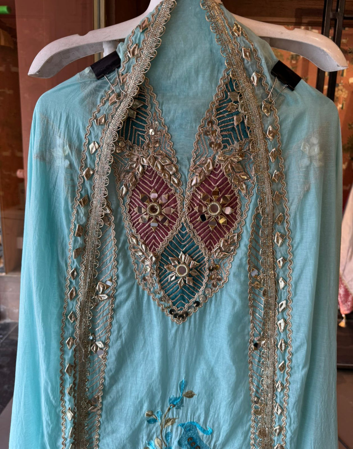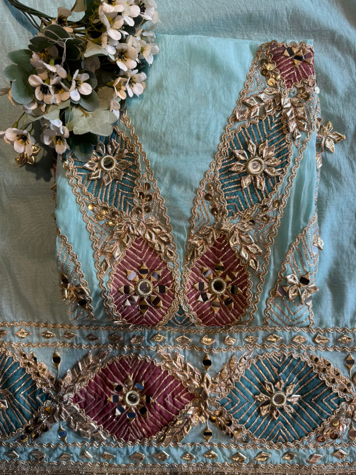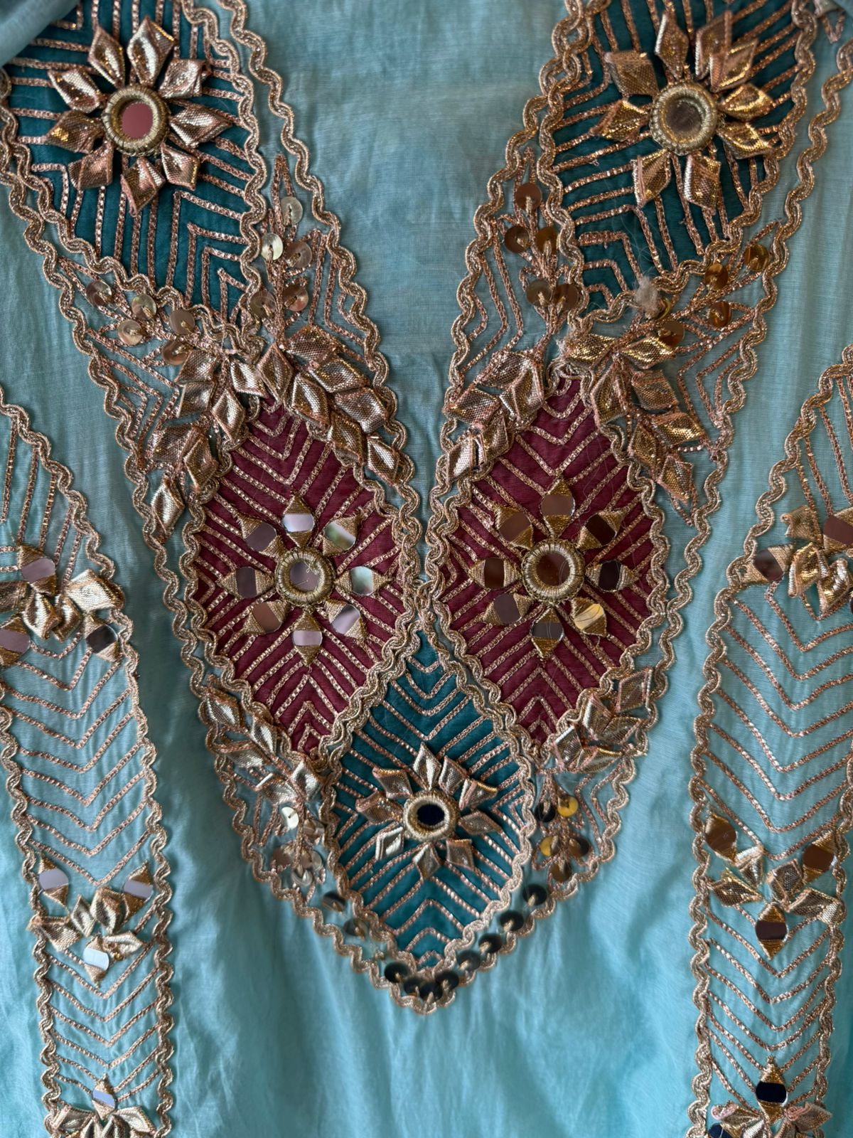Embedded mirror (shisha) work at motif centers. Outlined with scalloped zari borders.