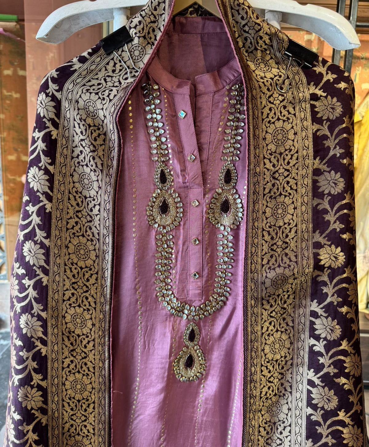 Russian silk Unstitched Shirt with neckline made, The neck has a very beautiful Kundan necklace with thread detailings.