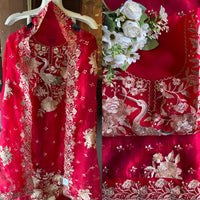 Floral motifs are scattered all over the dupatta with heavy thread embroidered four sides border.
