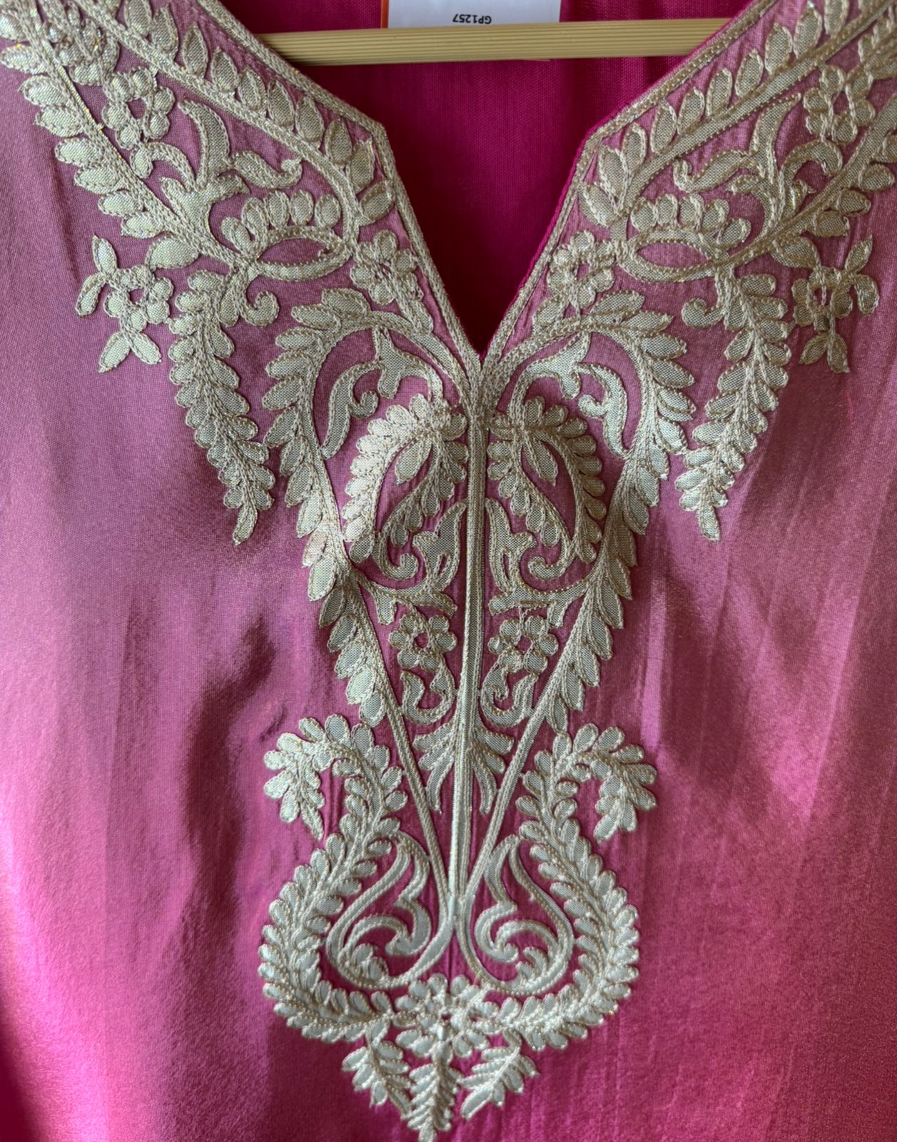 Full sleeves with embroidered motifs and border at the cuff edges.