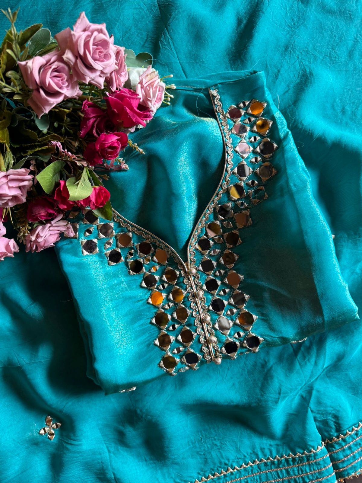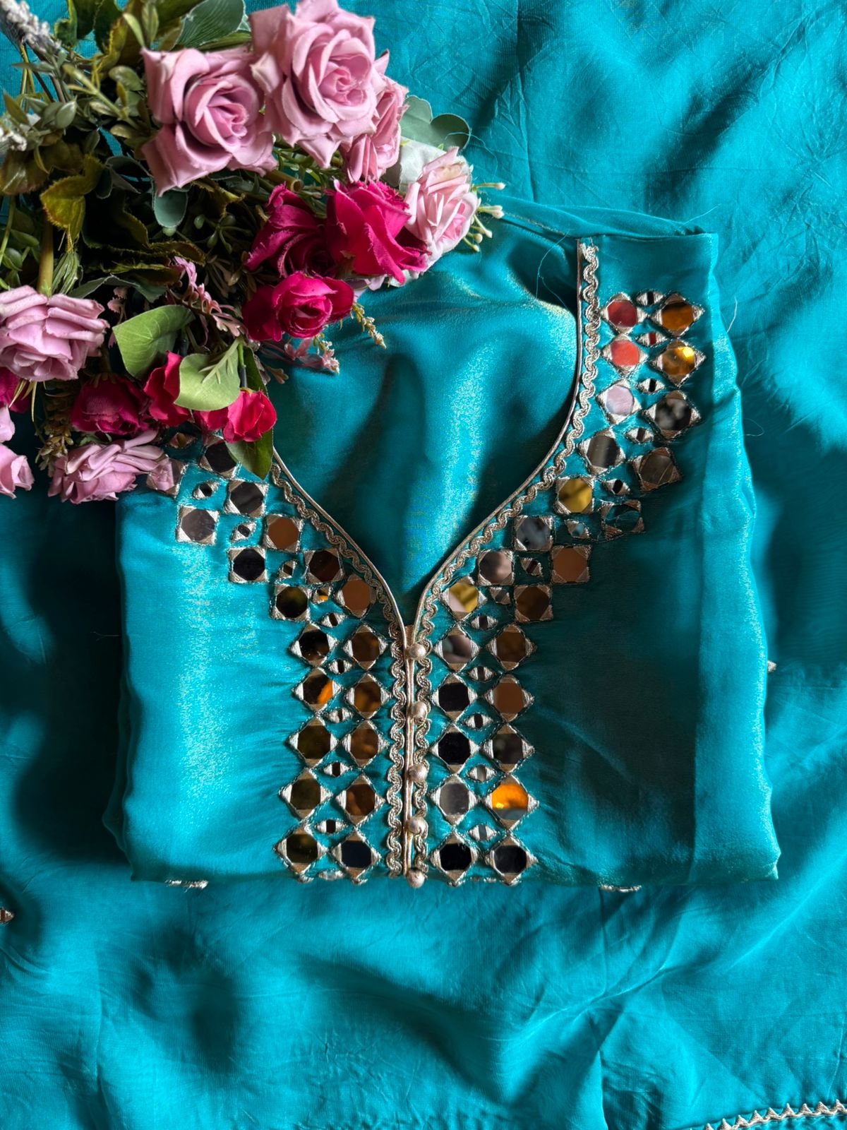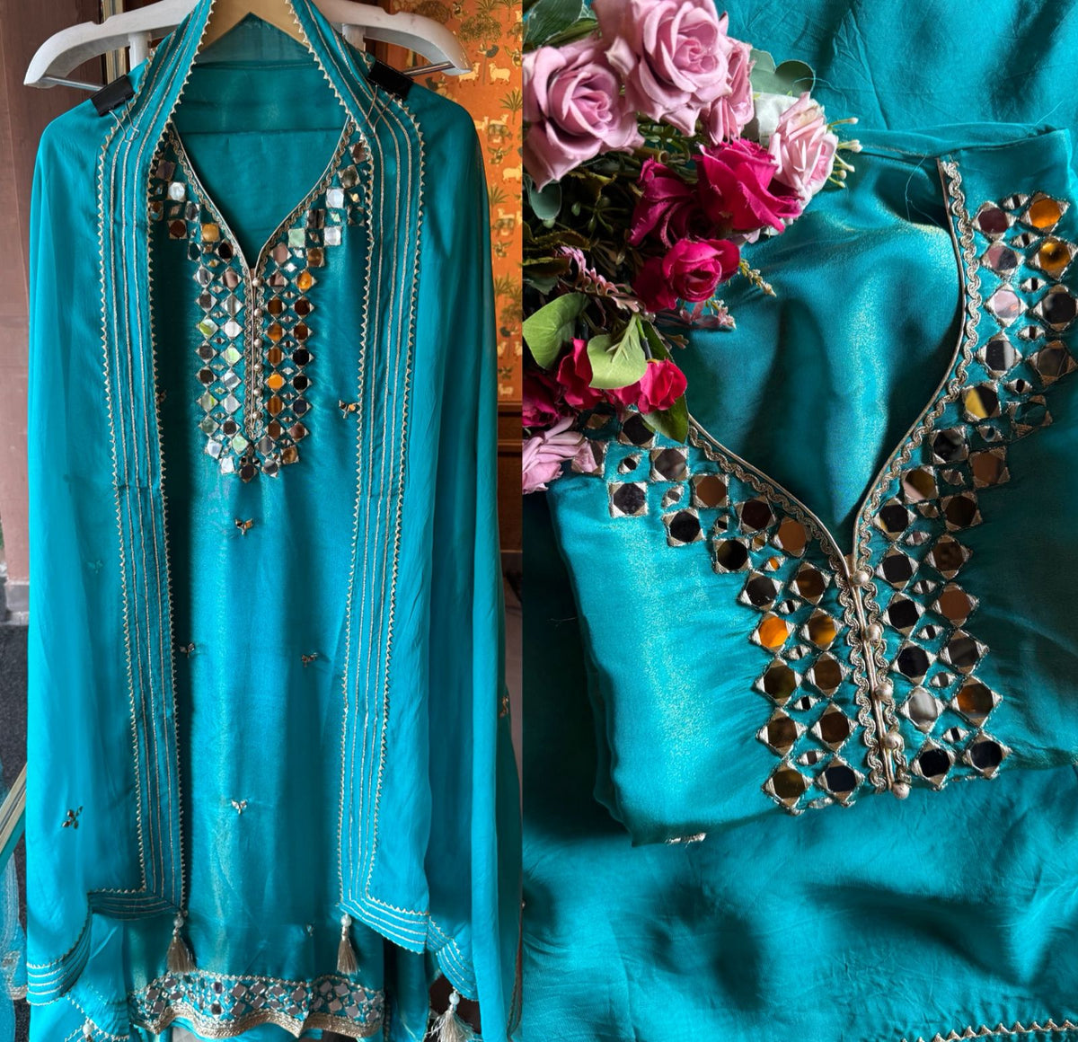 Shimmer tissue unstitched Suits with beautiful original mirror work , Properly stitched with Zari.