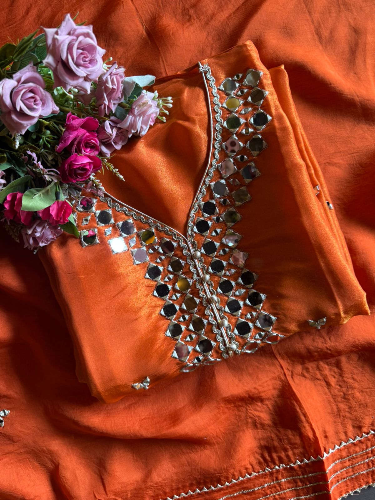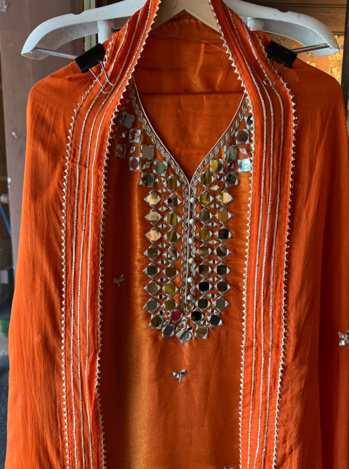 Shimmer tissue unstitched Suits with beautiful original mirror work , Properly stitched with Zari.