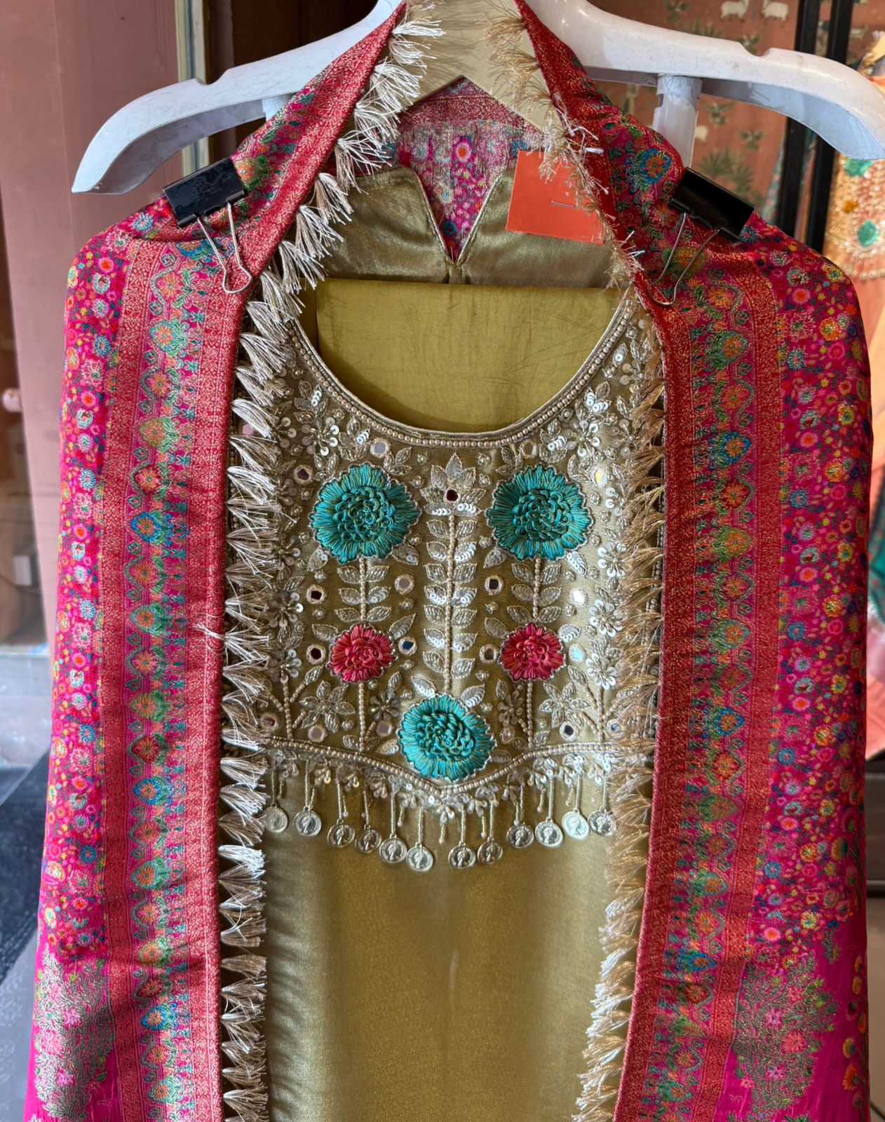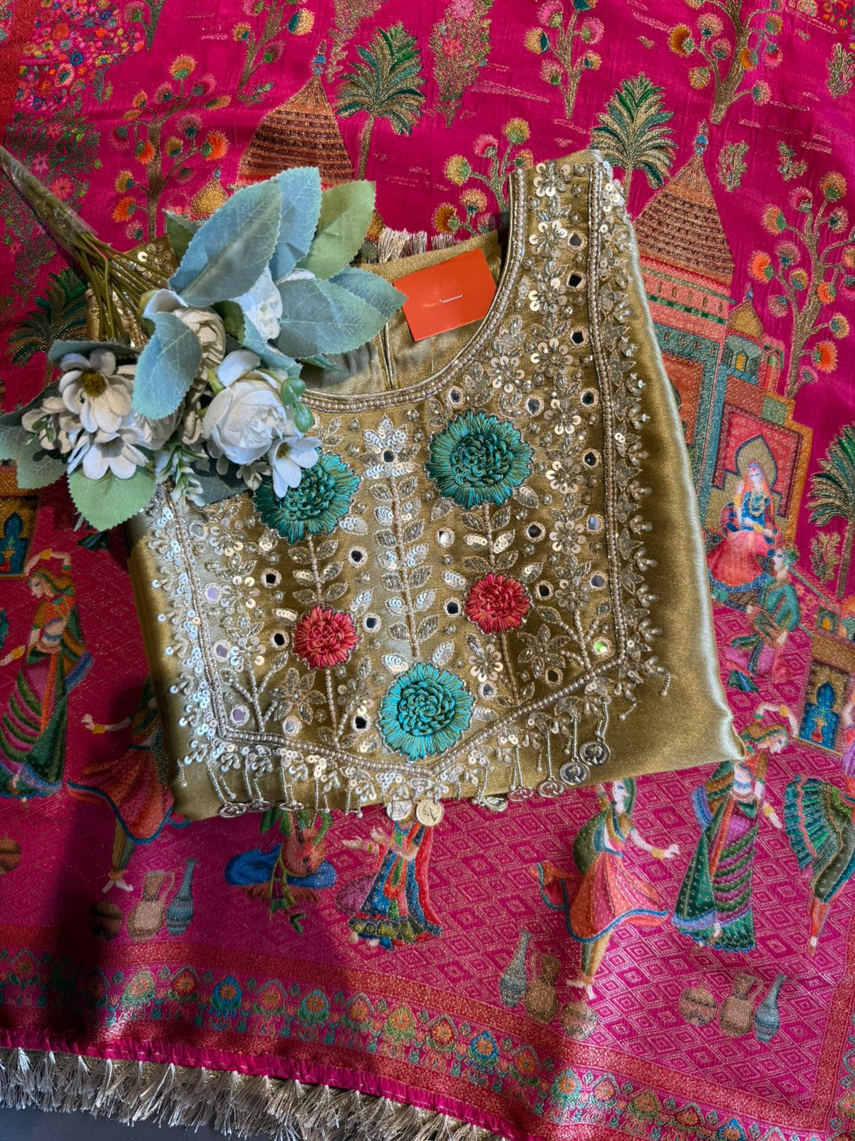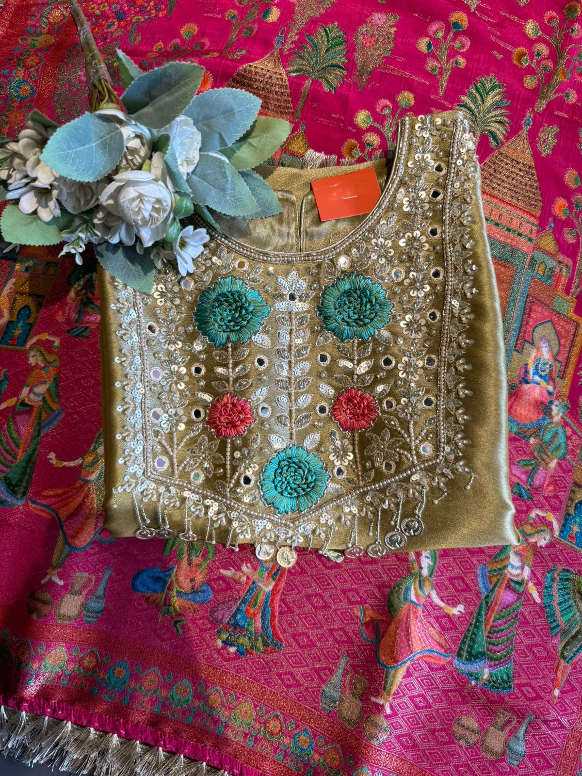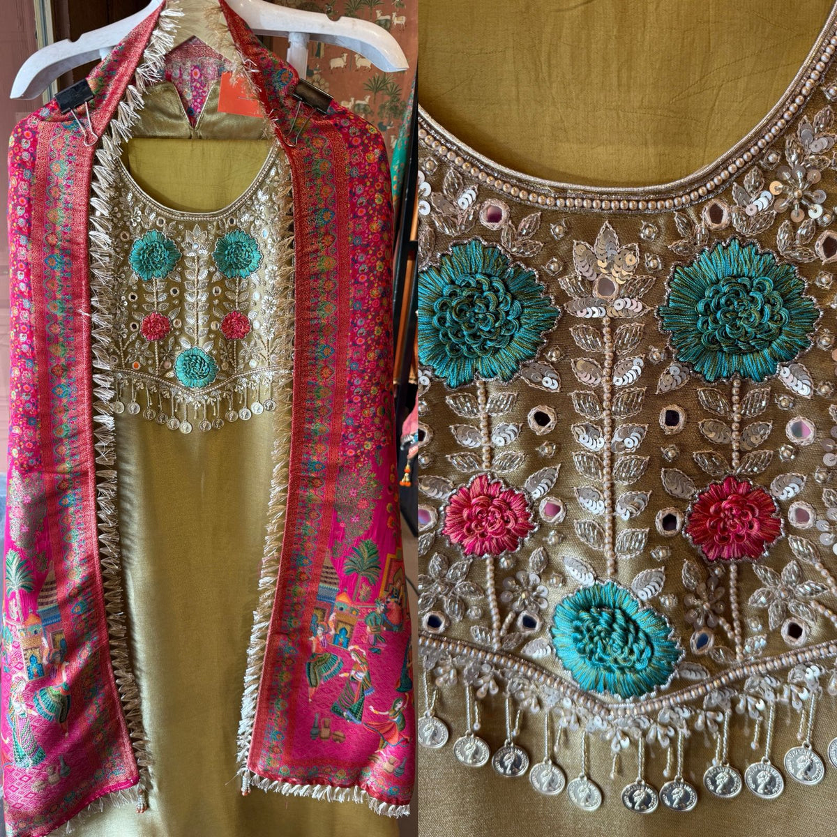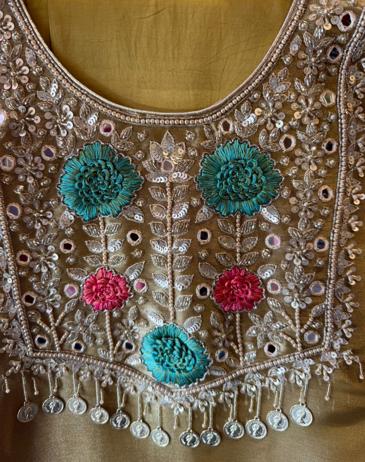 Heavy handcrafted embroidery with resham thread, zari & sequin detailing