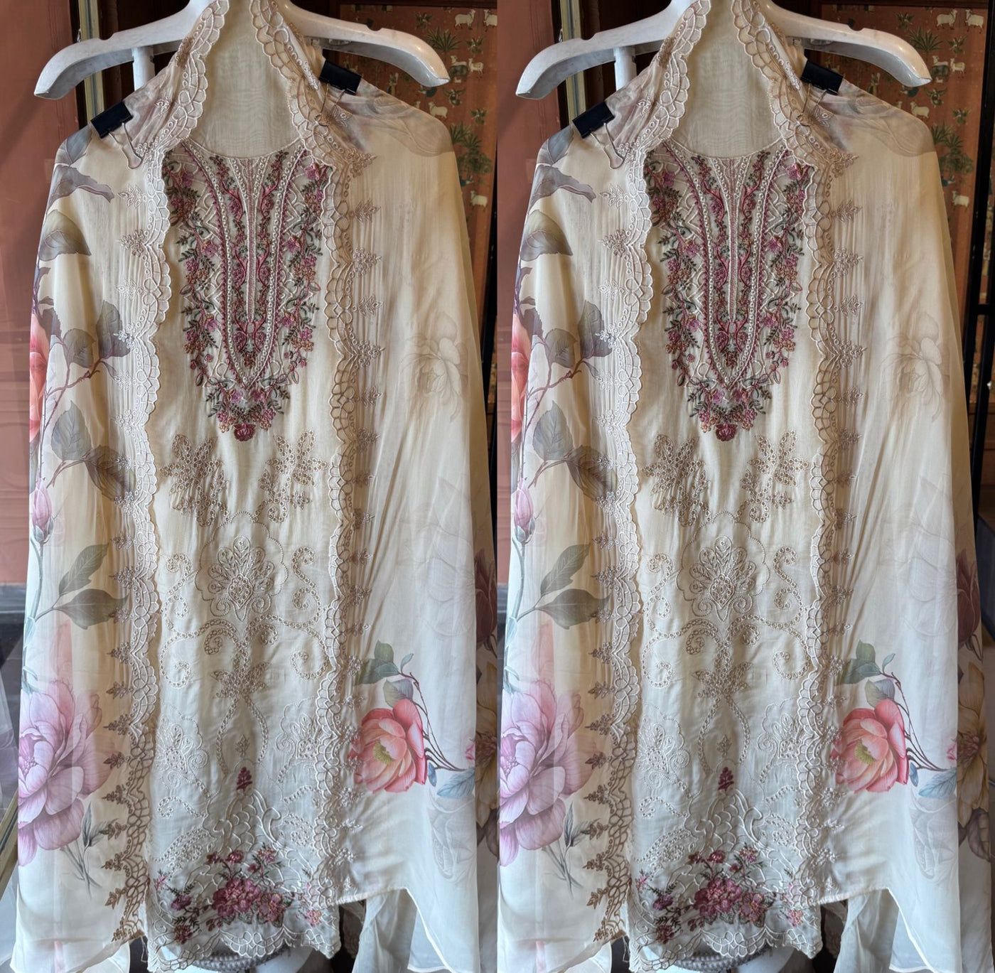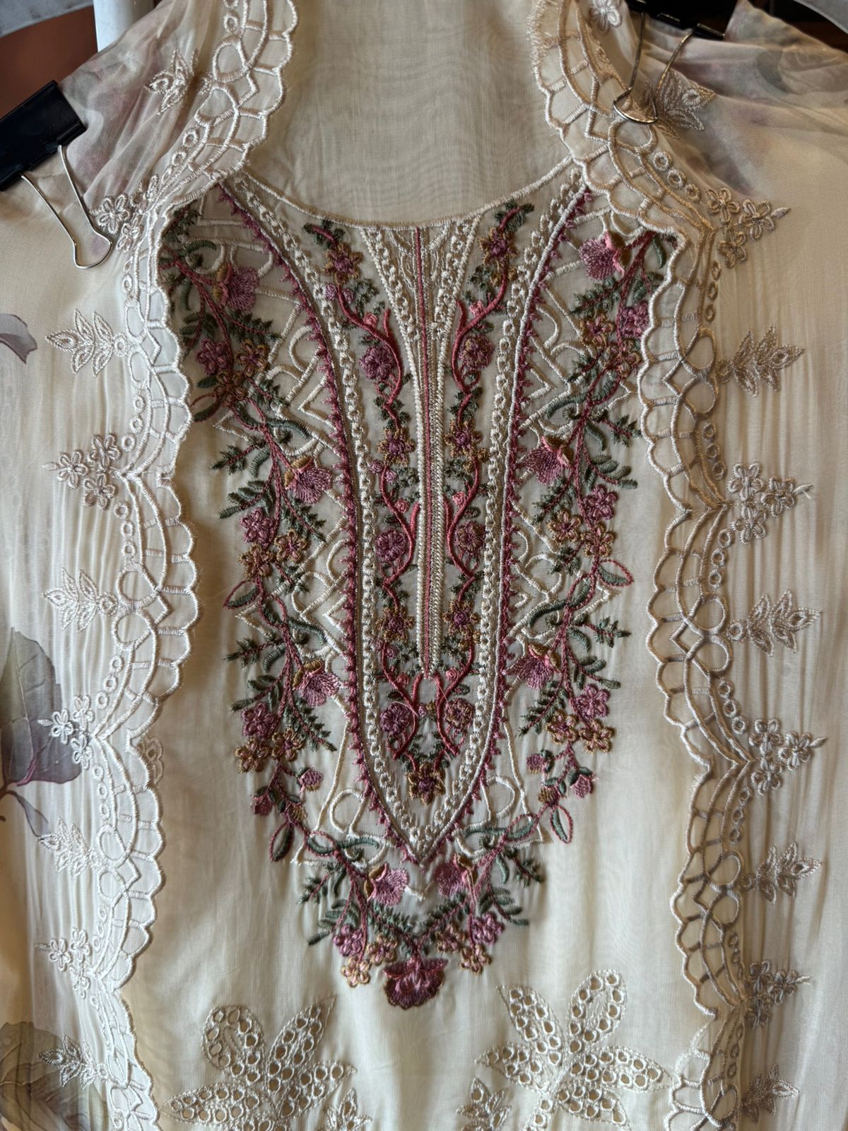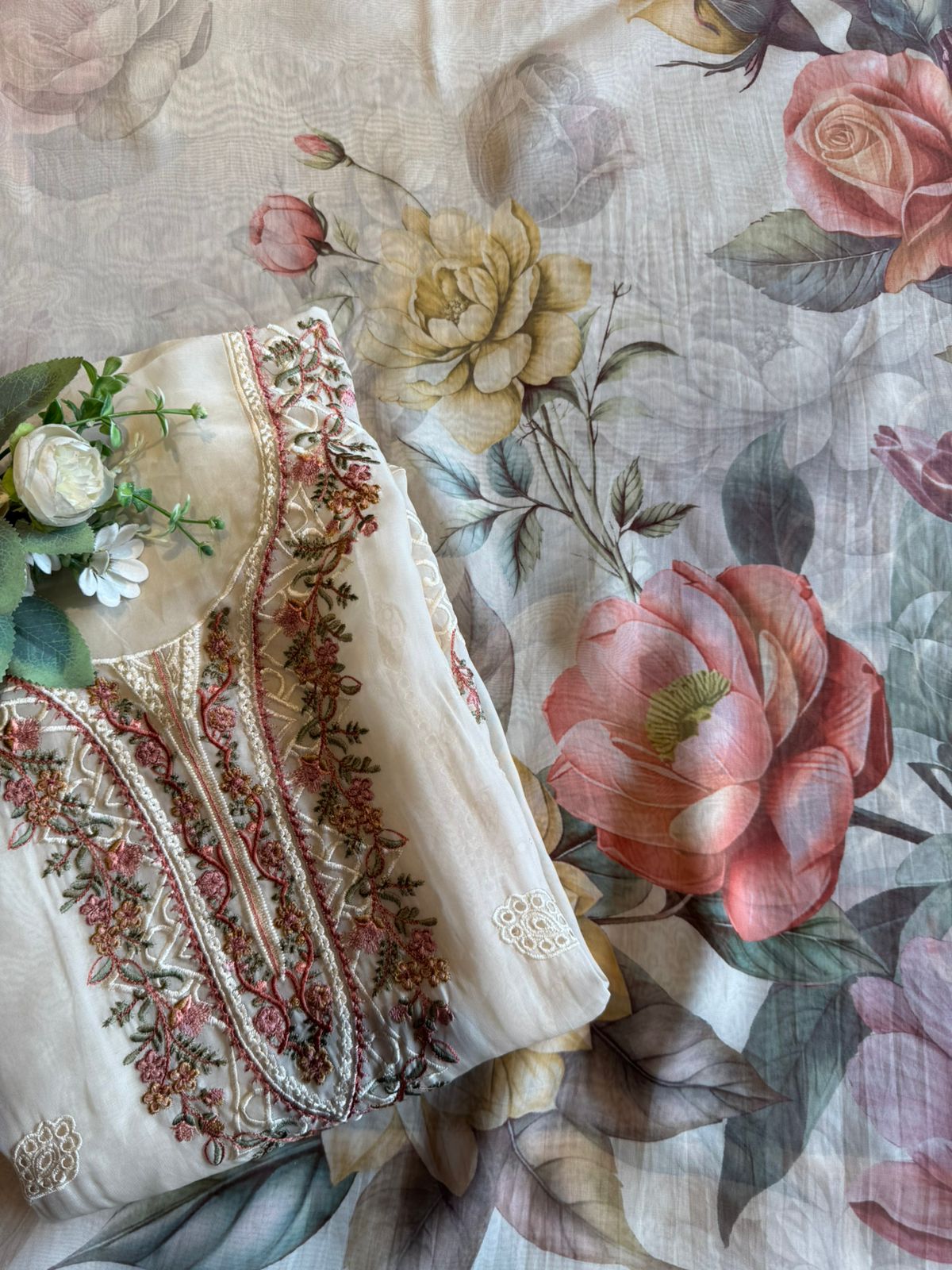 Soft organza Unstitched Shirt with Thread embroidered front (Chicken work) Soft thread work with contrast Floral Kadhai.