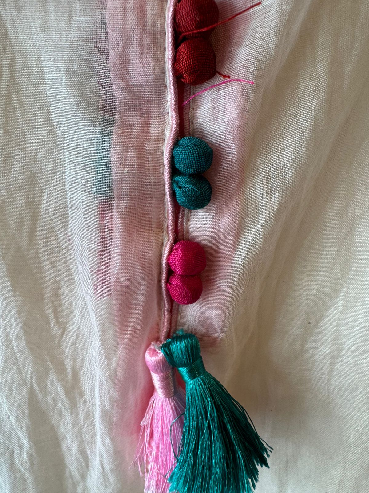 Decorative latkan tassels with beads in pink and teal at the neckline.
