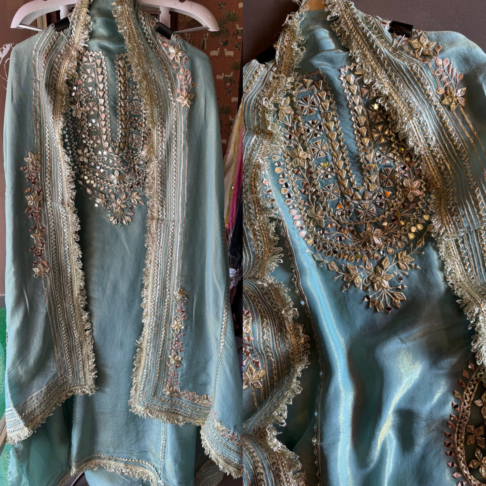 Soft shimmer tissue Unstitched Full Size shirt with heavily embroidered gotta work done (Mirror and Gotta work with Zari embroidery) , Gotta laces (Beautiful Work)