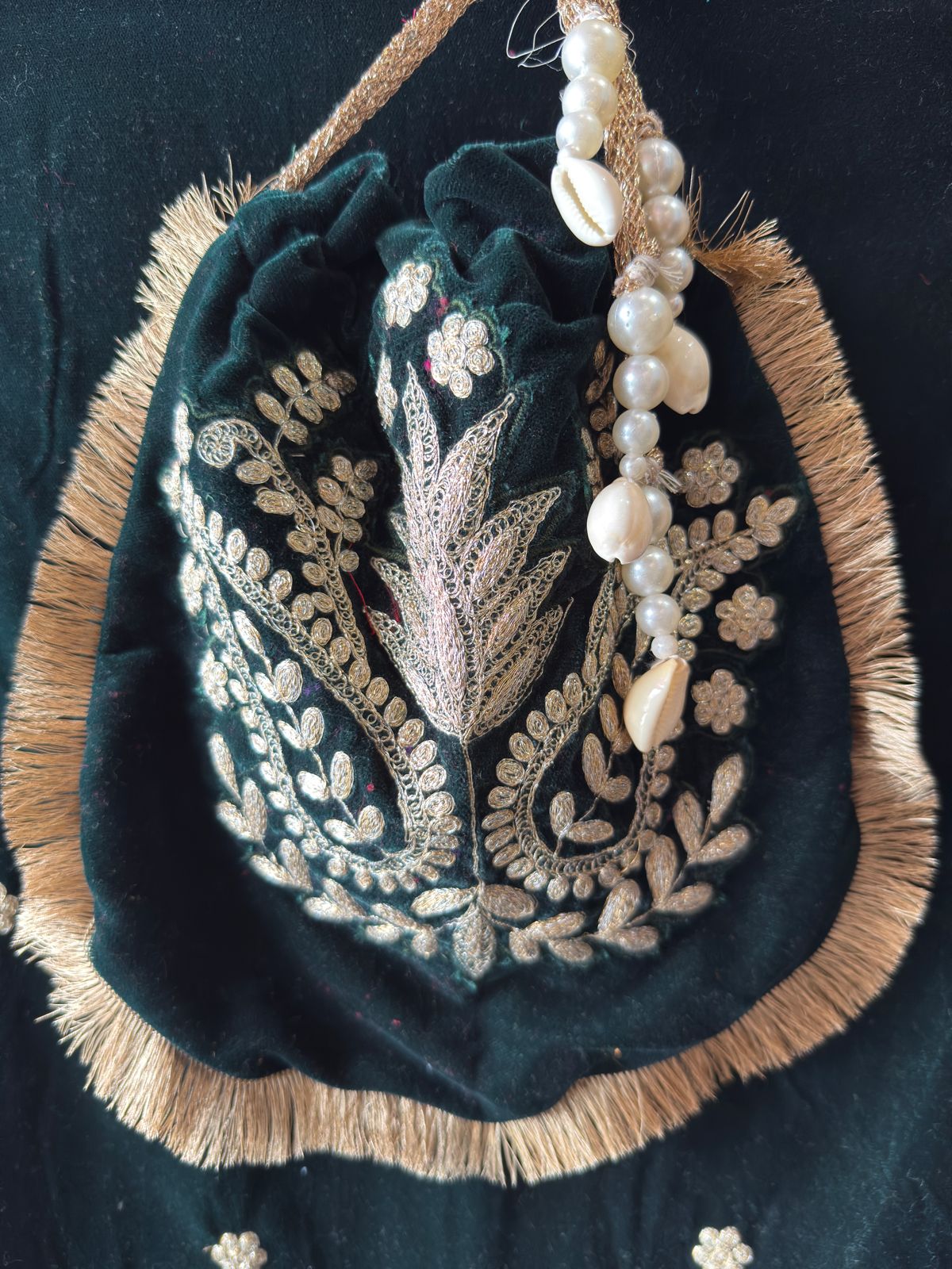 The outfit is paired with a matching mini potli bag, designed with the same border and fringes.