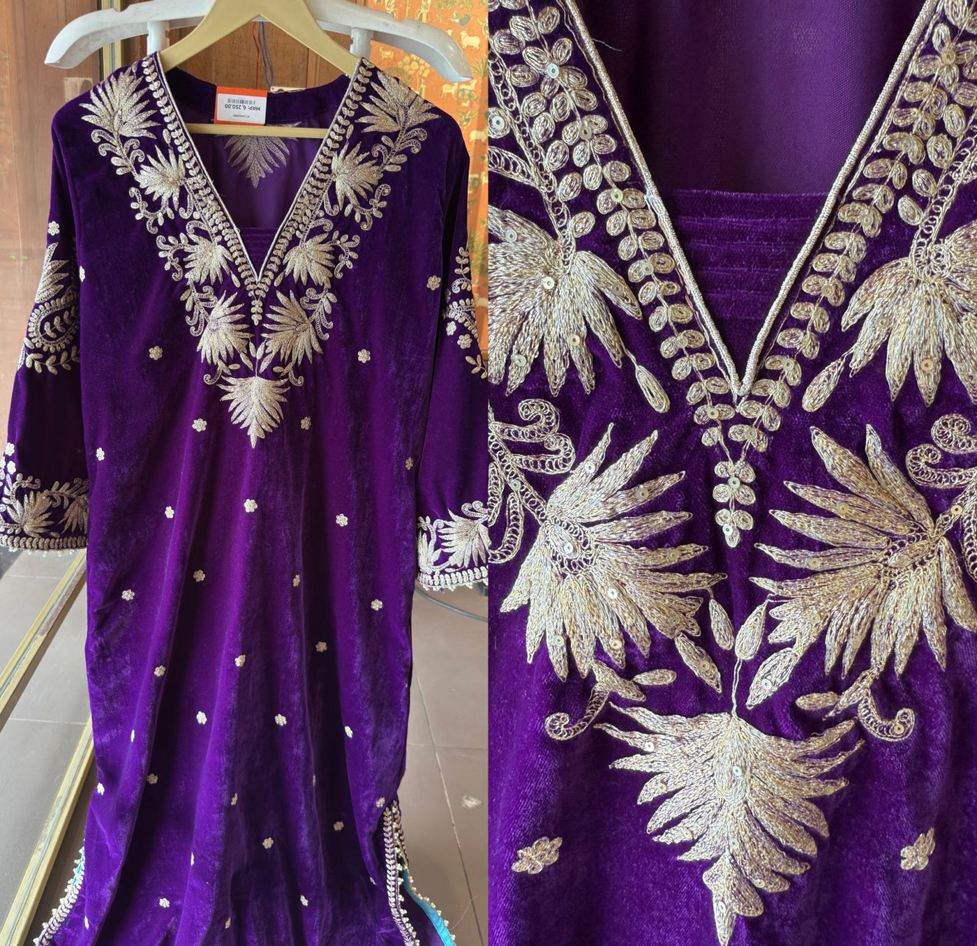 The full set has Light gold ari work embroidery , giving it a kashmirir look.