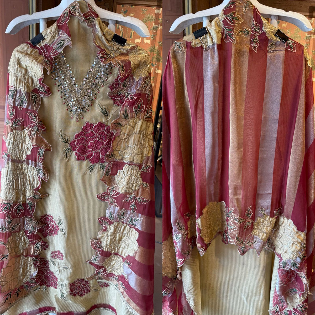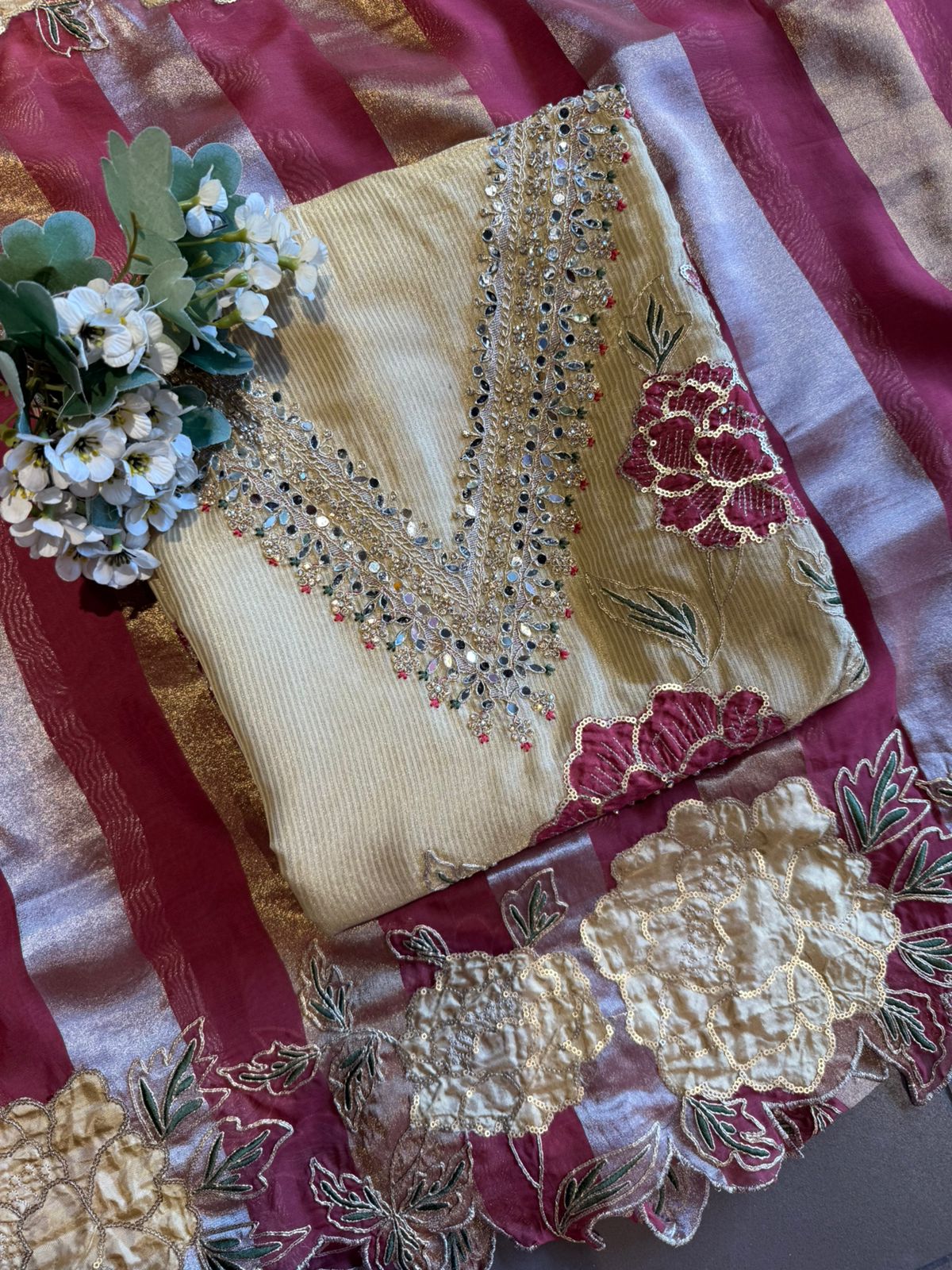 Striped organza fabric Suit set , giving a luxurious sheen and rich depth.