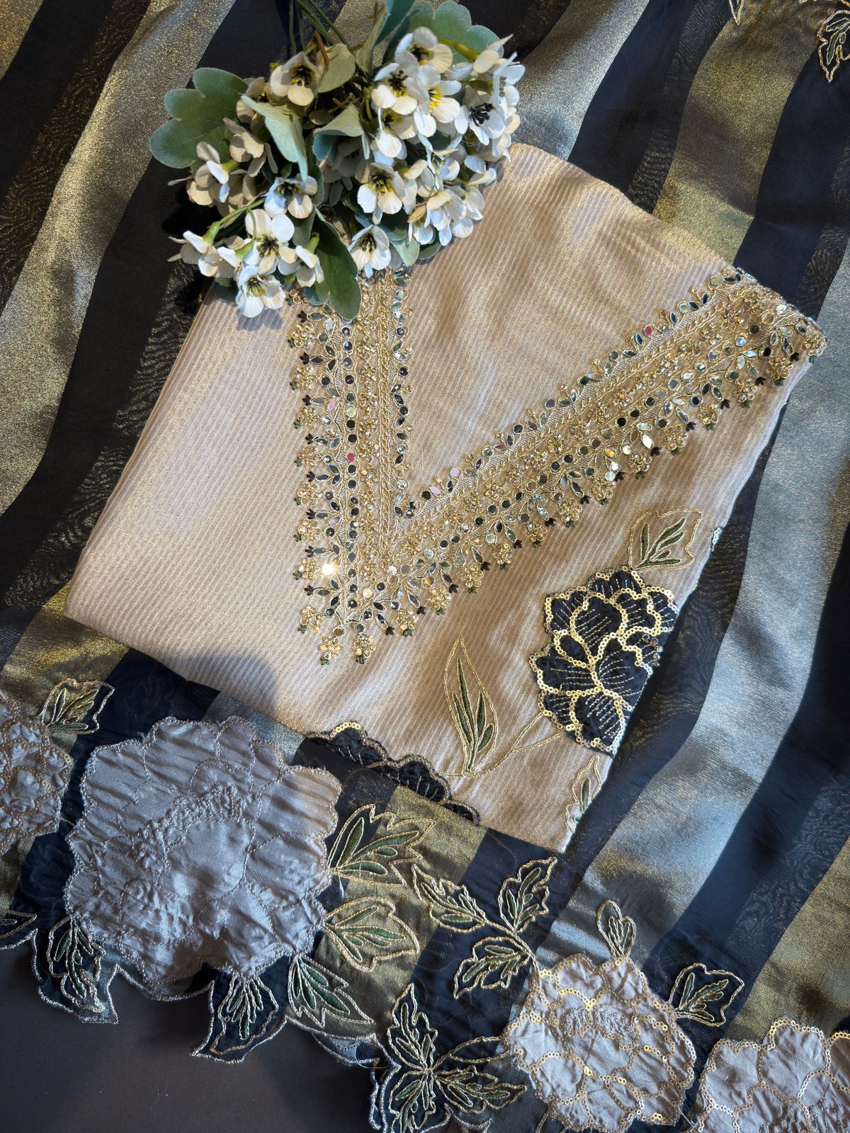 Gold metallic with Appliqué floral patchwork done on the borders with cutwork and Zari outlining.