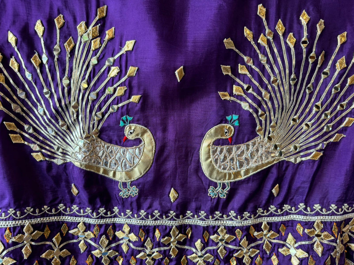 Lower part of the kurta features peacock motifs in gold embroidery.