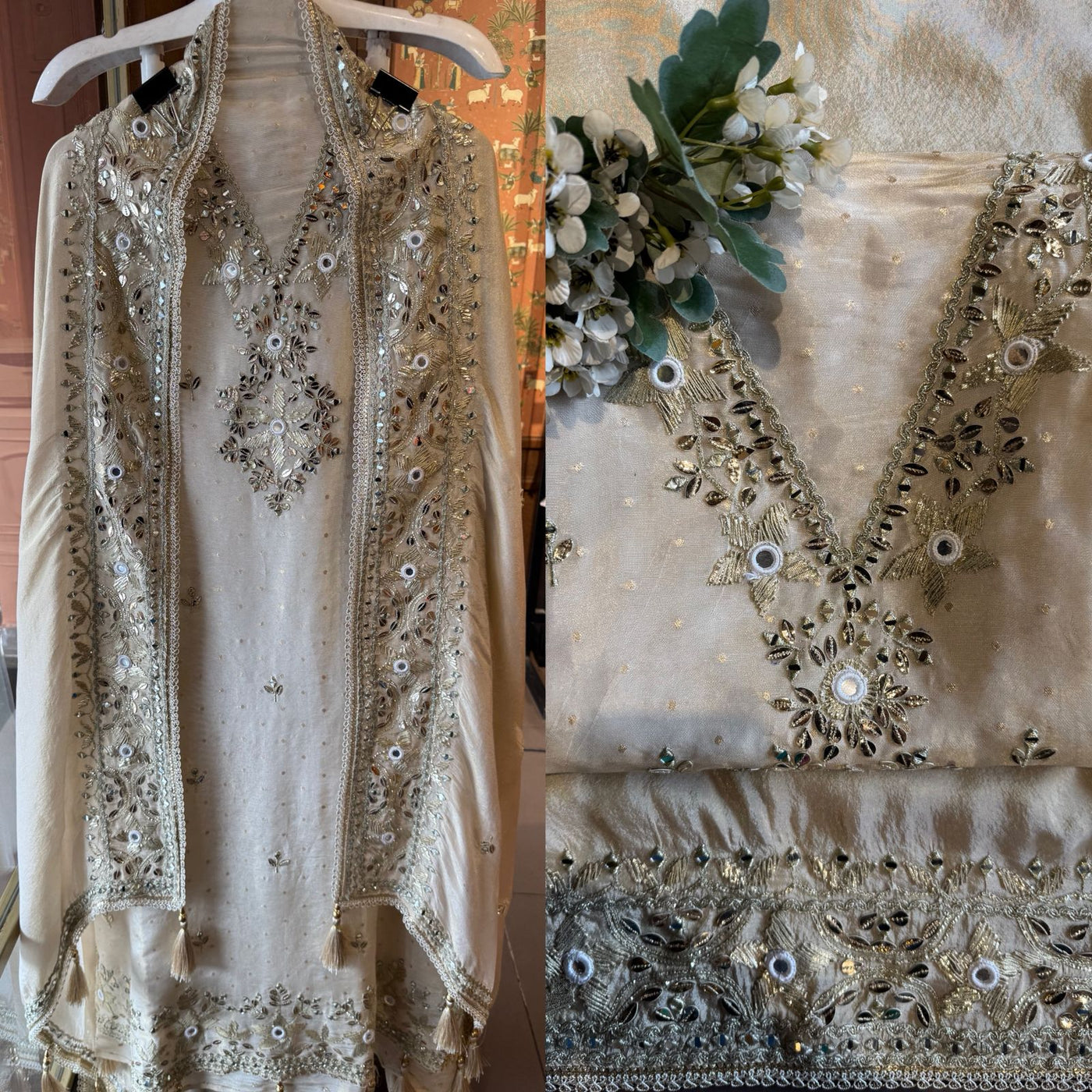 Broad embroidered border at the hem with mirrors and metallic thread.