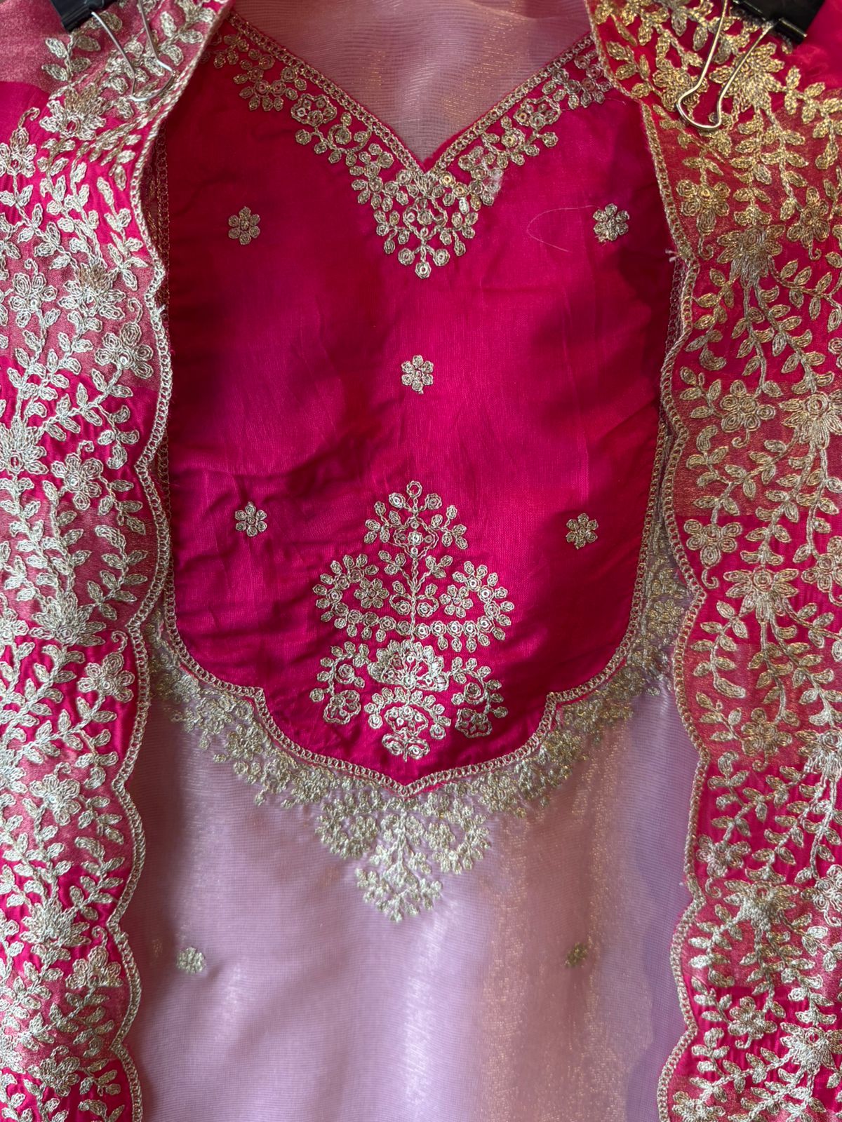 Rich scalloped silver zari embroidery on one longer side of the dupatta.