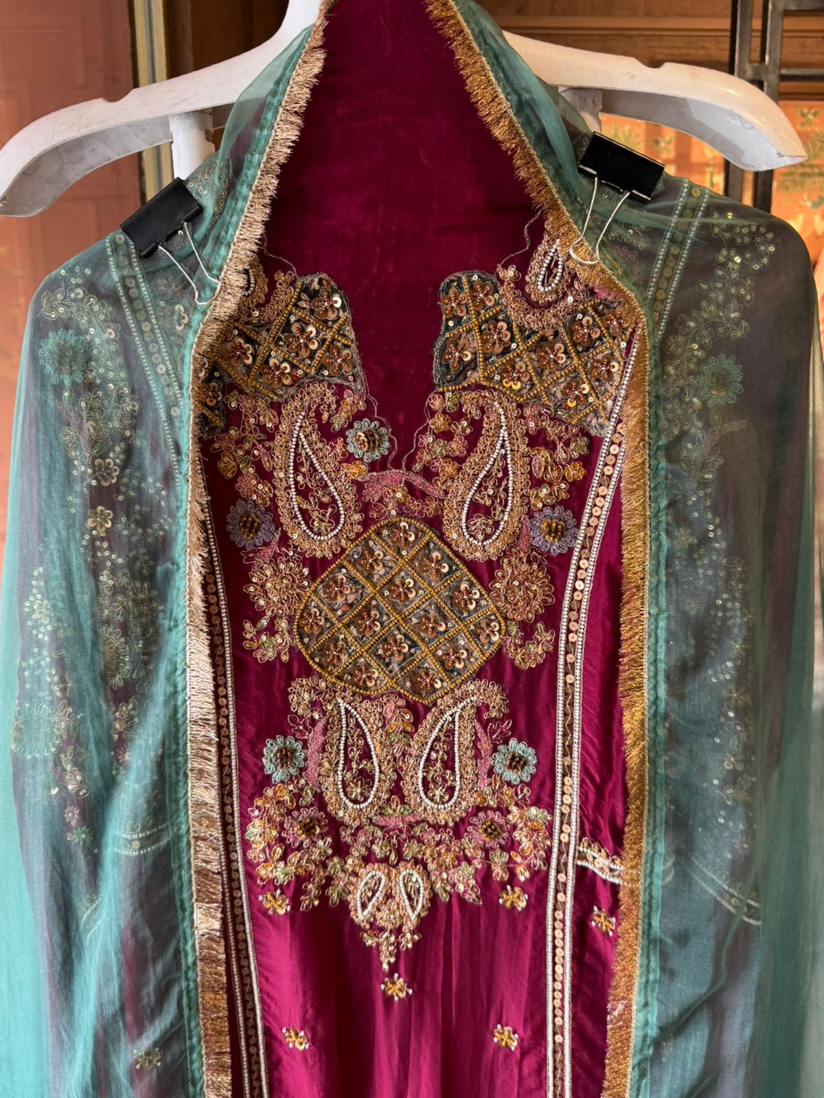 Intricate floral, paisley, and lattice (jaal) motifs on the yoke
