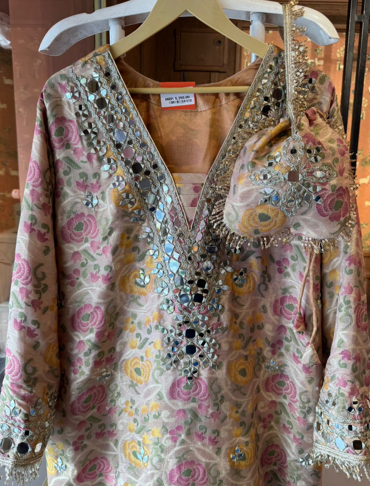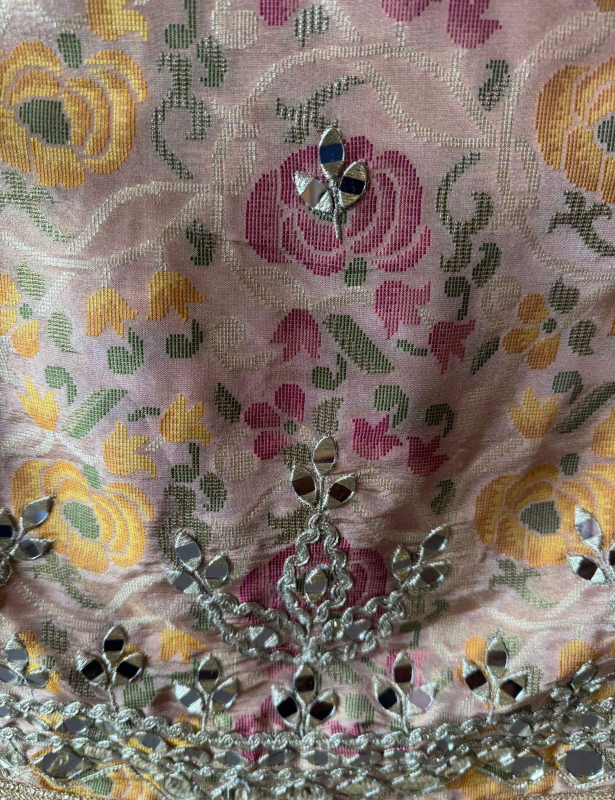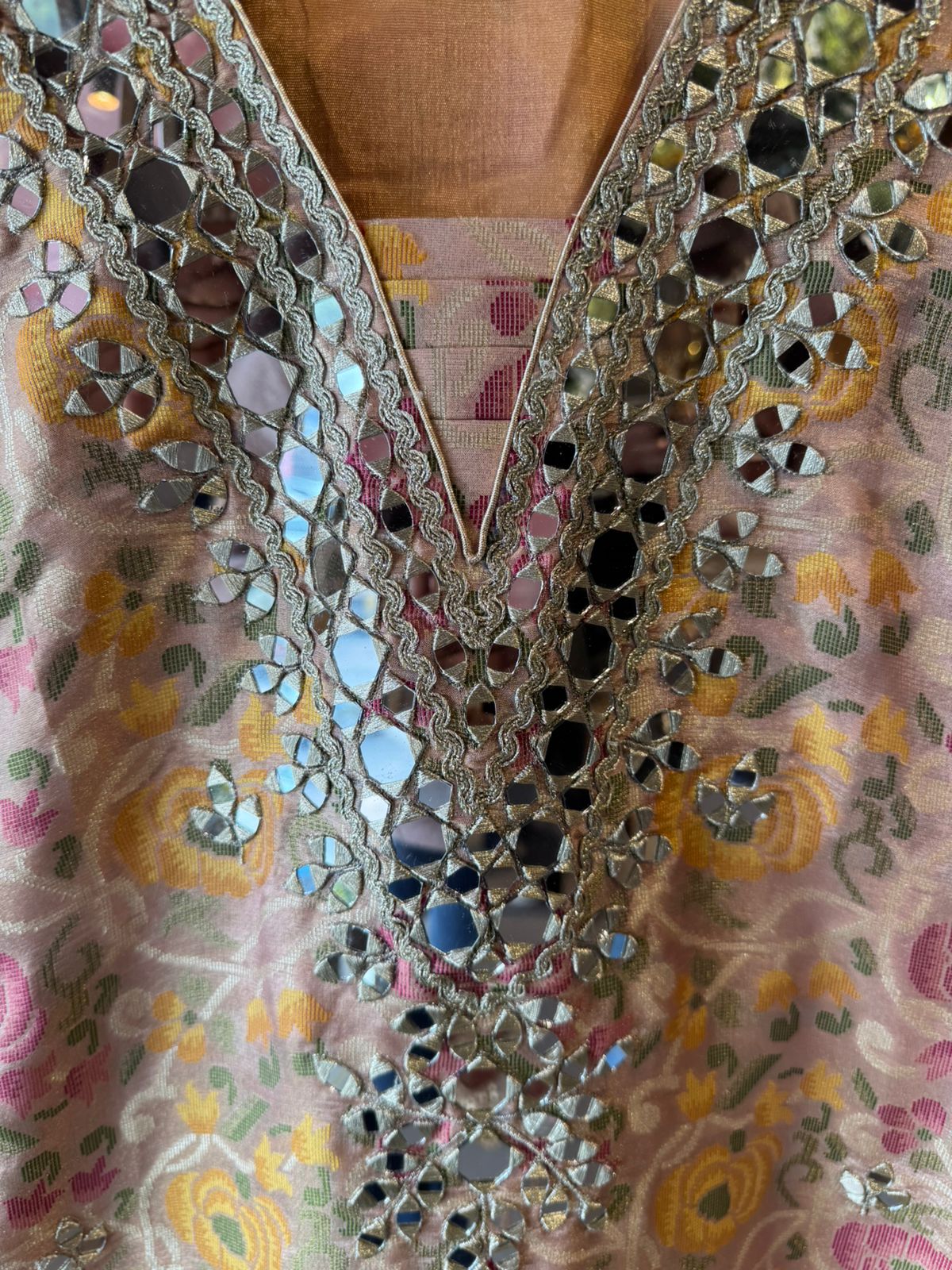 The neckline is beautifully decorated with mirrors and Zaid work.