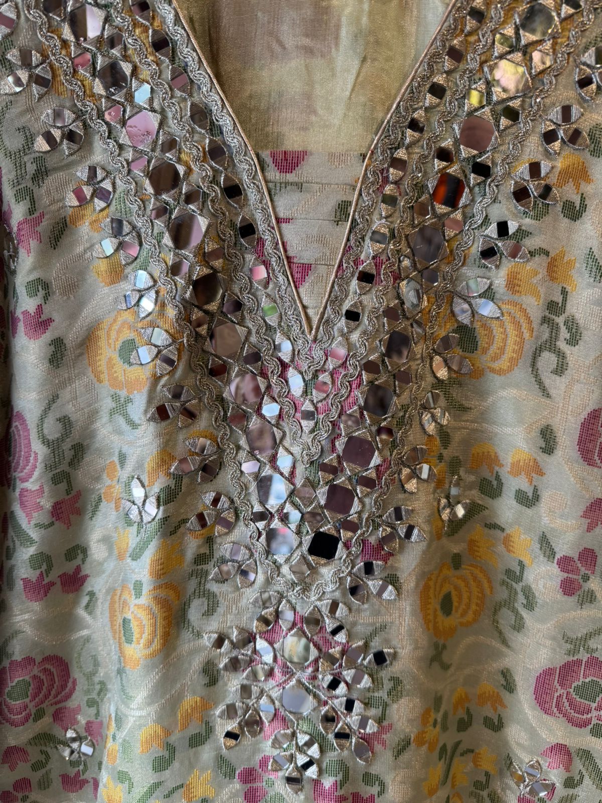 The neckline is beautifully decorated with mirrors and Zaid work.