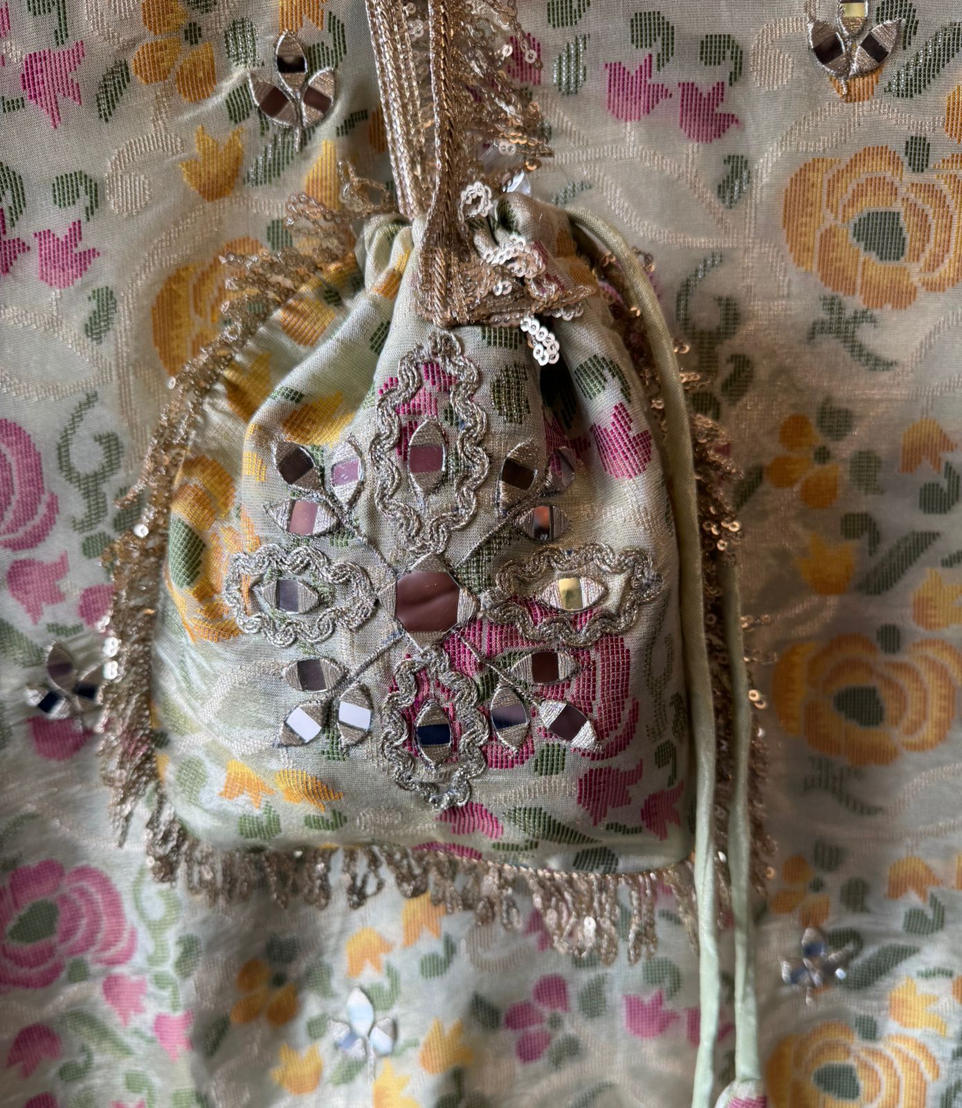 The neckline, sleeves, hem, and matching potli bag all feature hand-set real mirrors.
