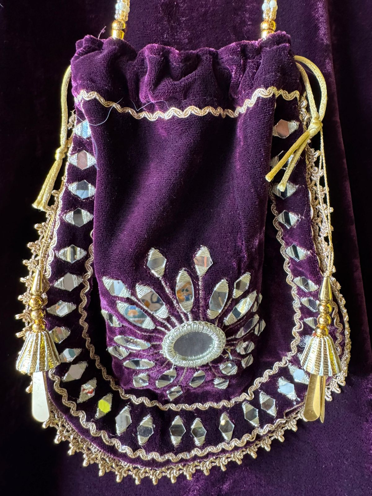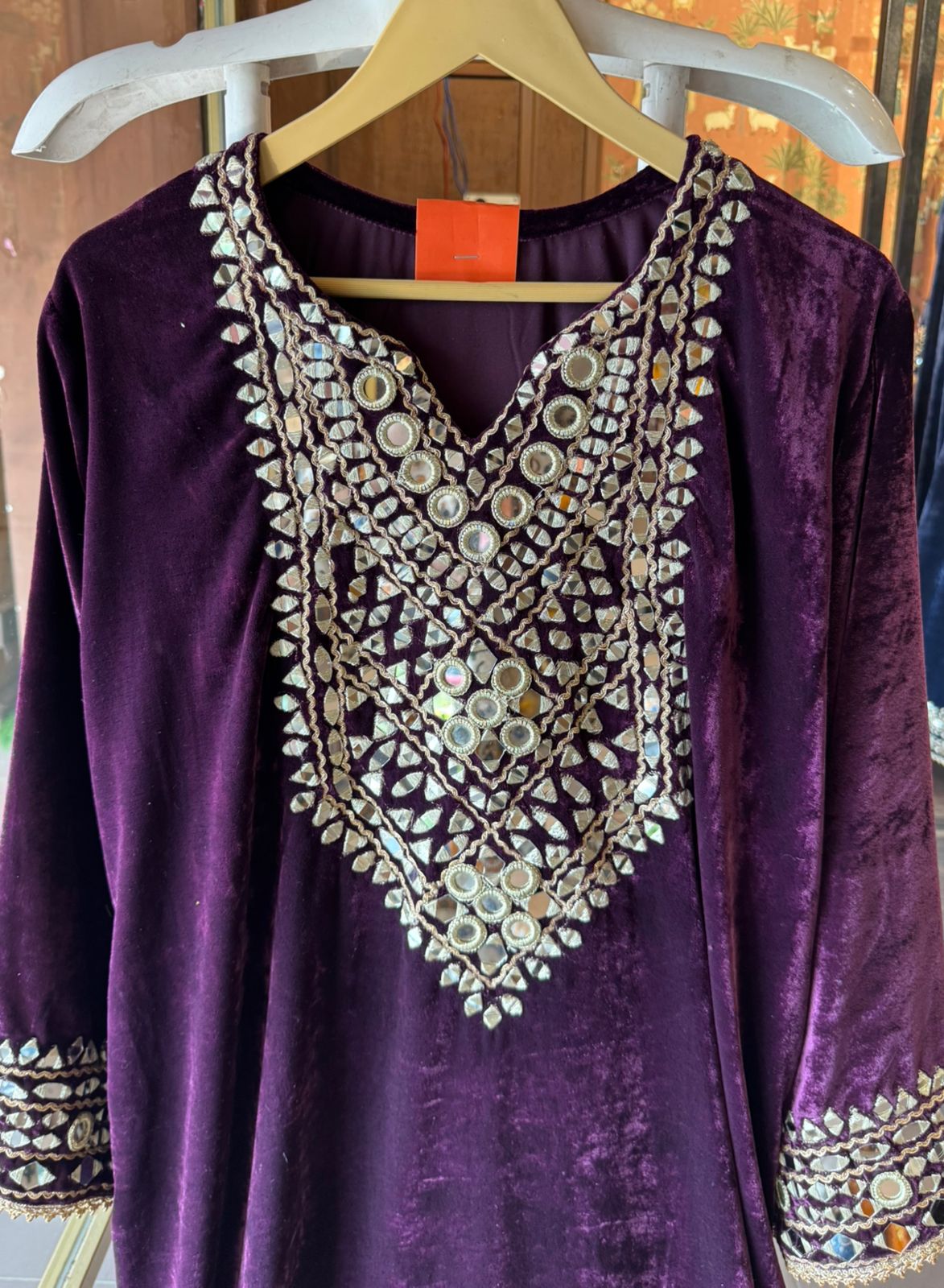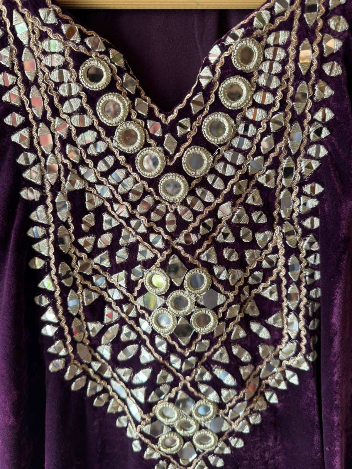 Heavy mirror work (shisha embroidery) on neckline, sleeves, and lower hem