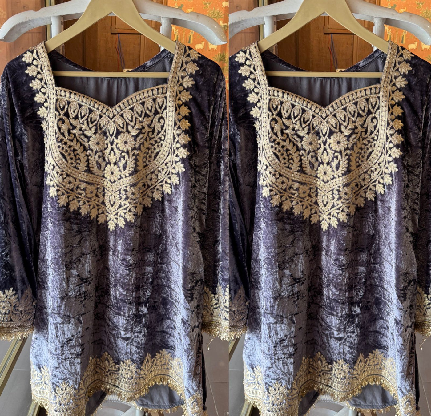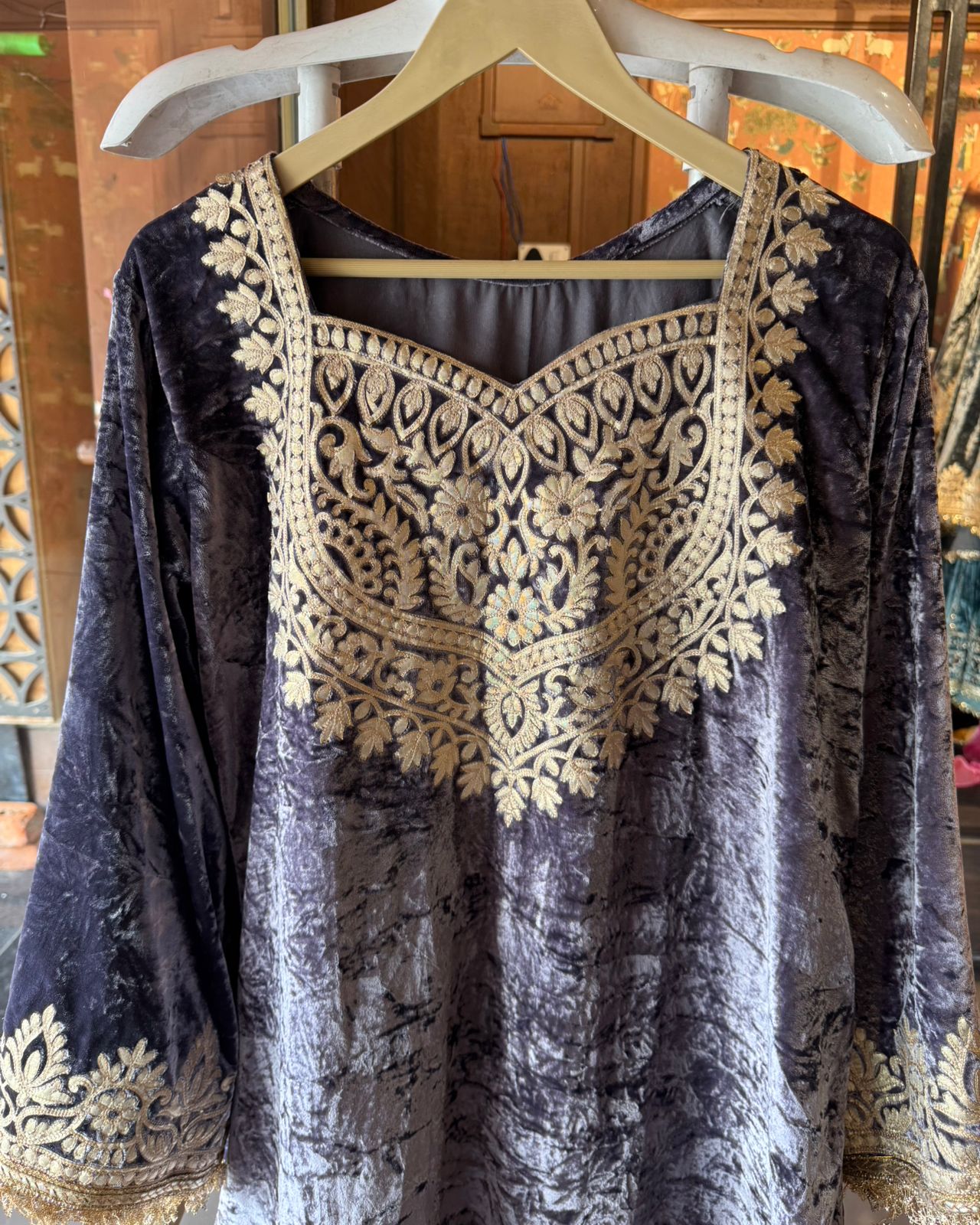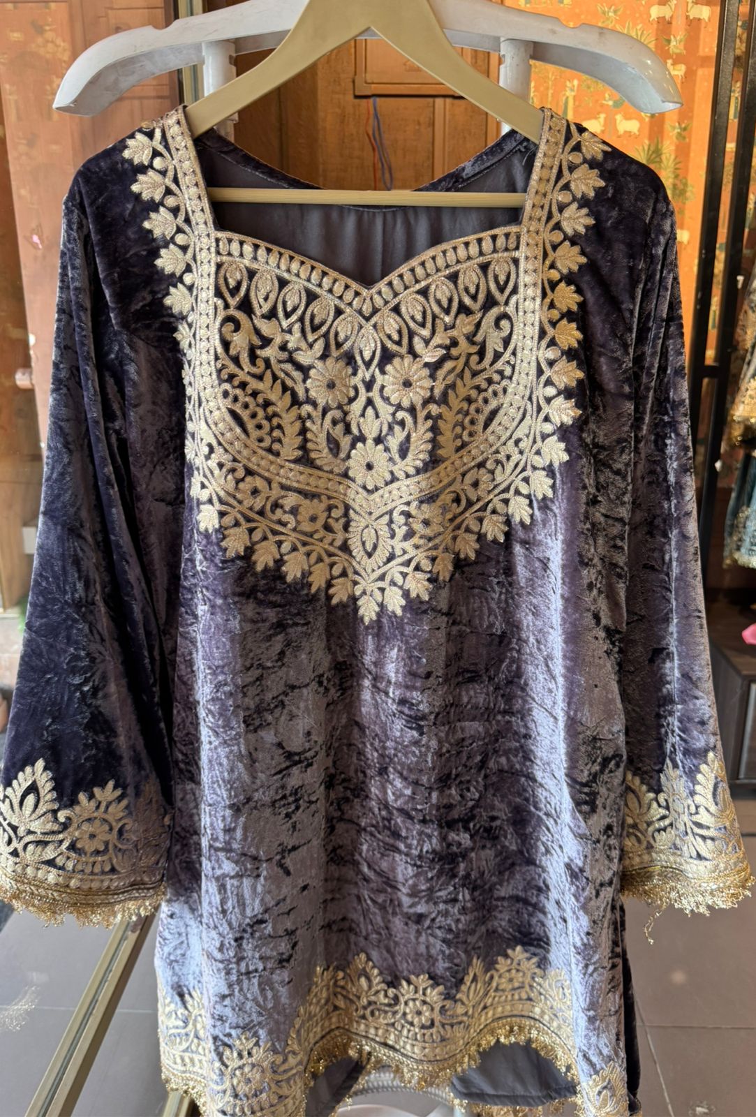 Traditional festive or formal ethnic wear — suitable for occasions, especially winter or evening events due to the velvet texture.