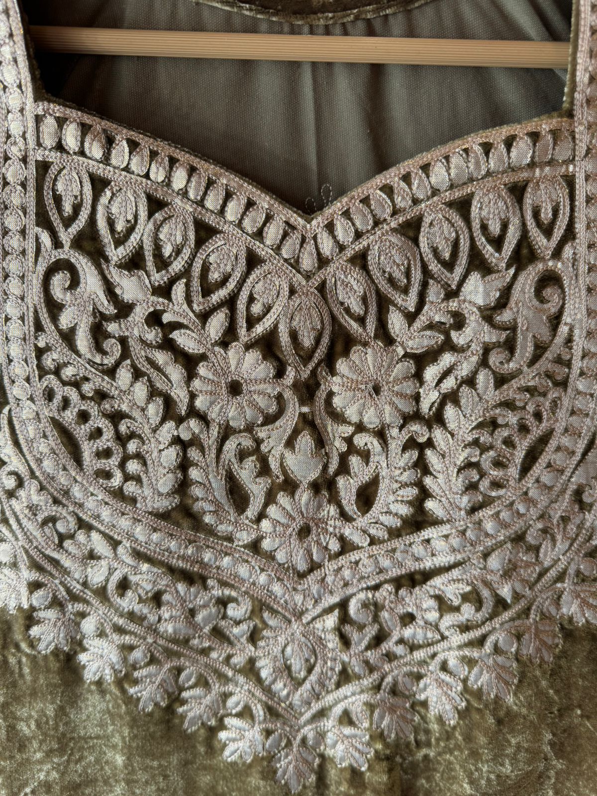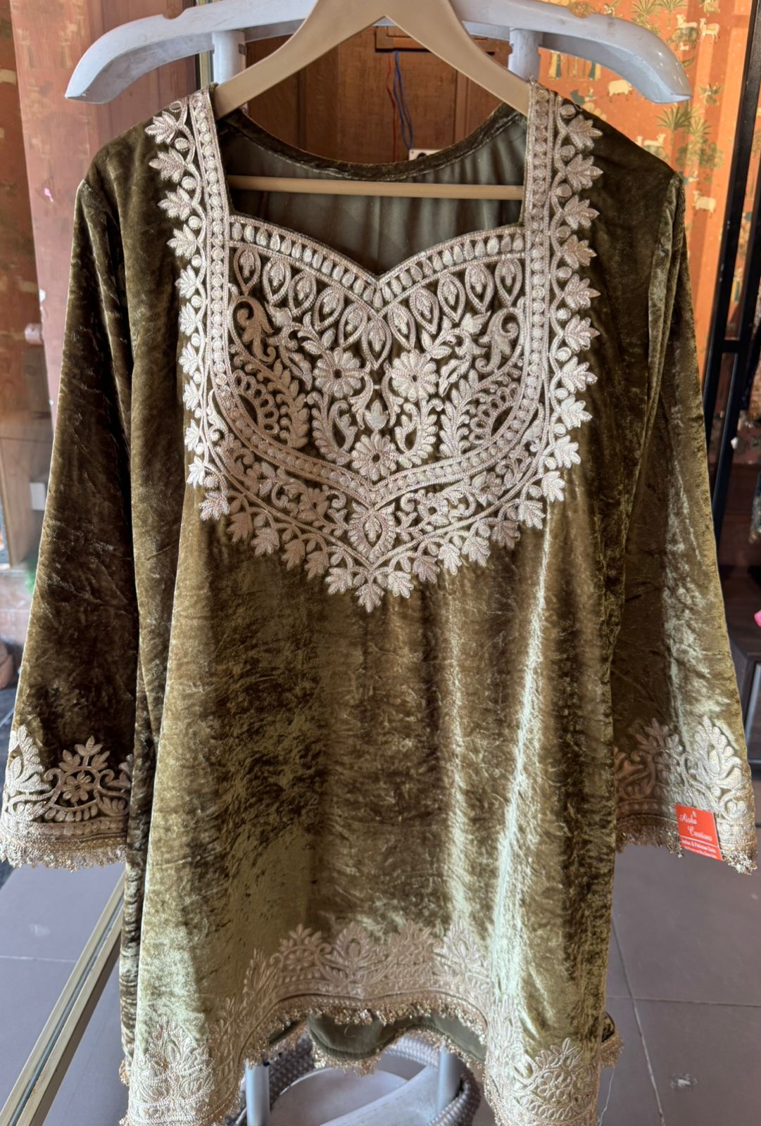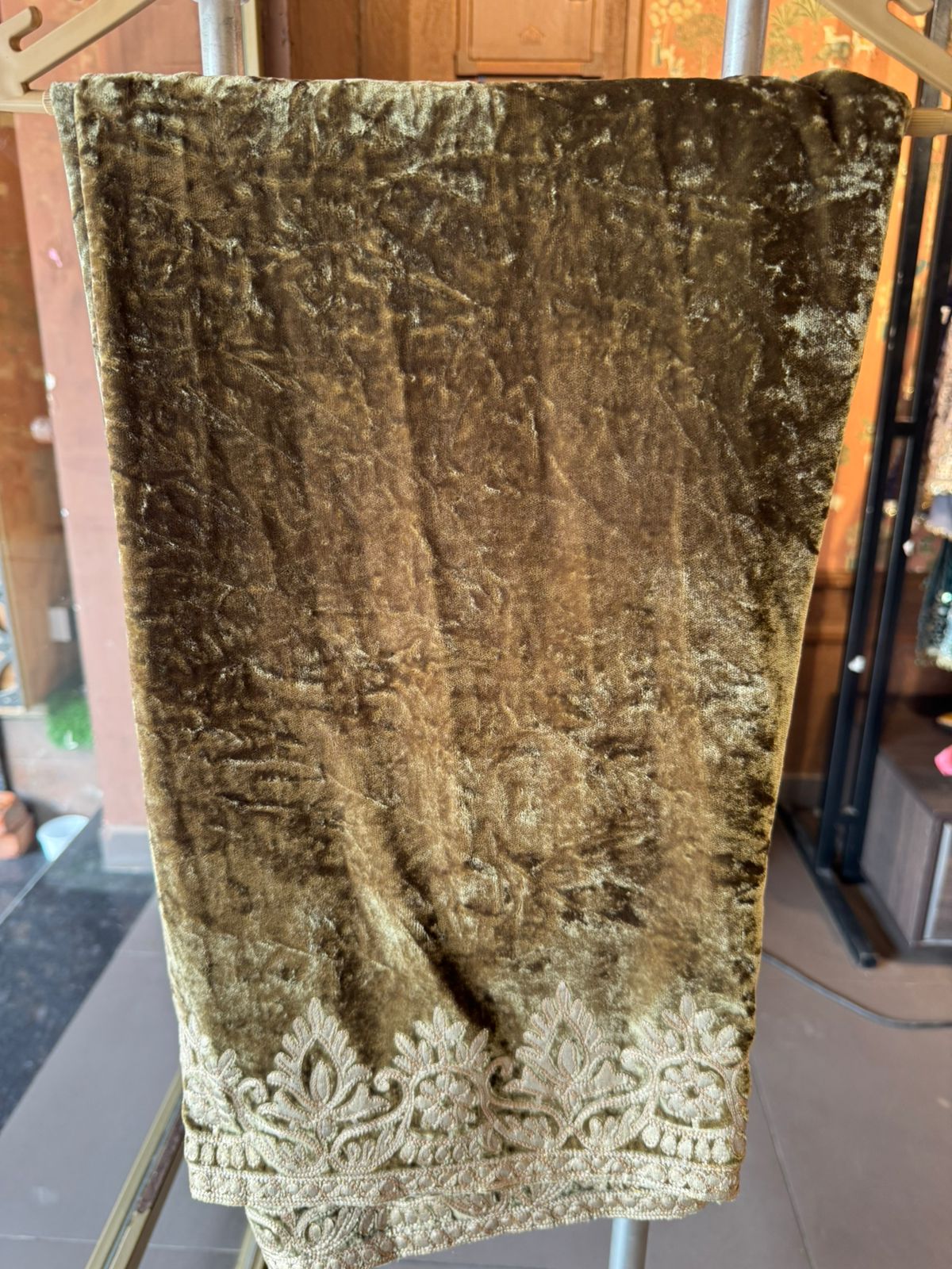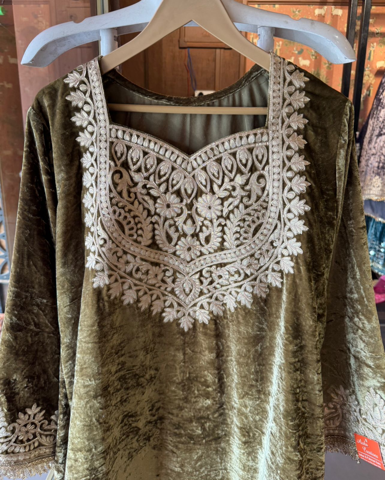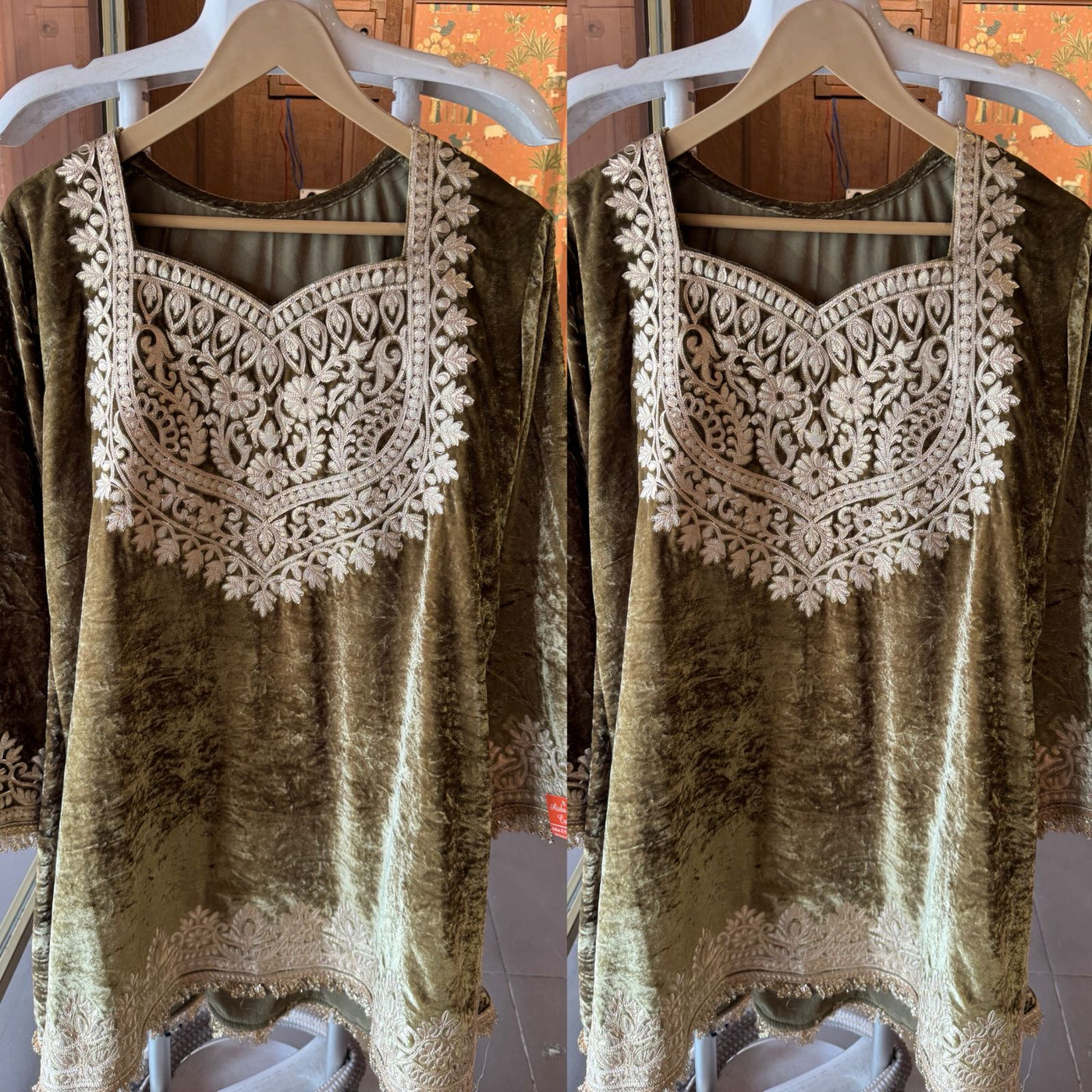 Traditional festive or formal ethnic wear — suitable for occasions, especially winter or evening events due to the velvet texture.
