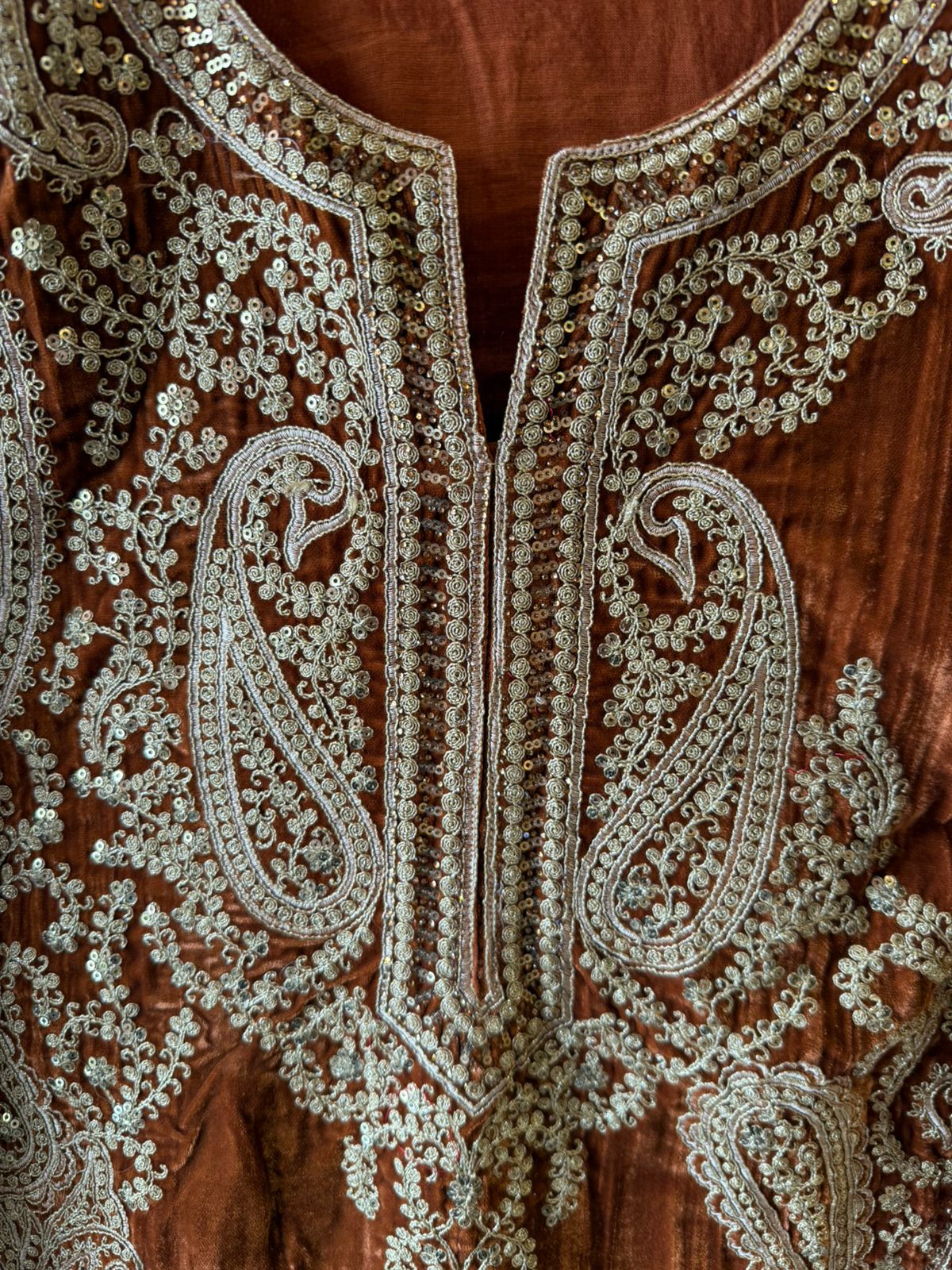 Fully adorned with intricate embroidery forming a border around the neck.