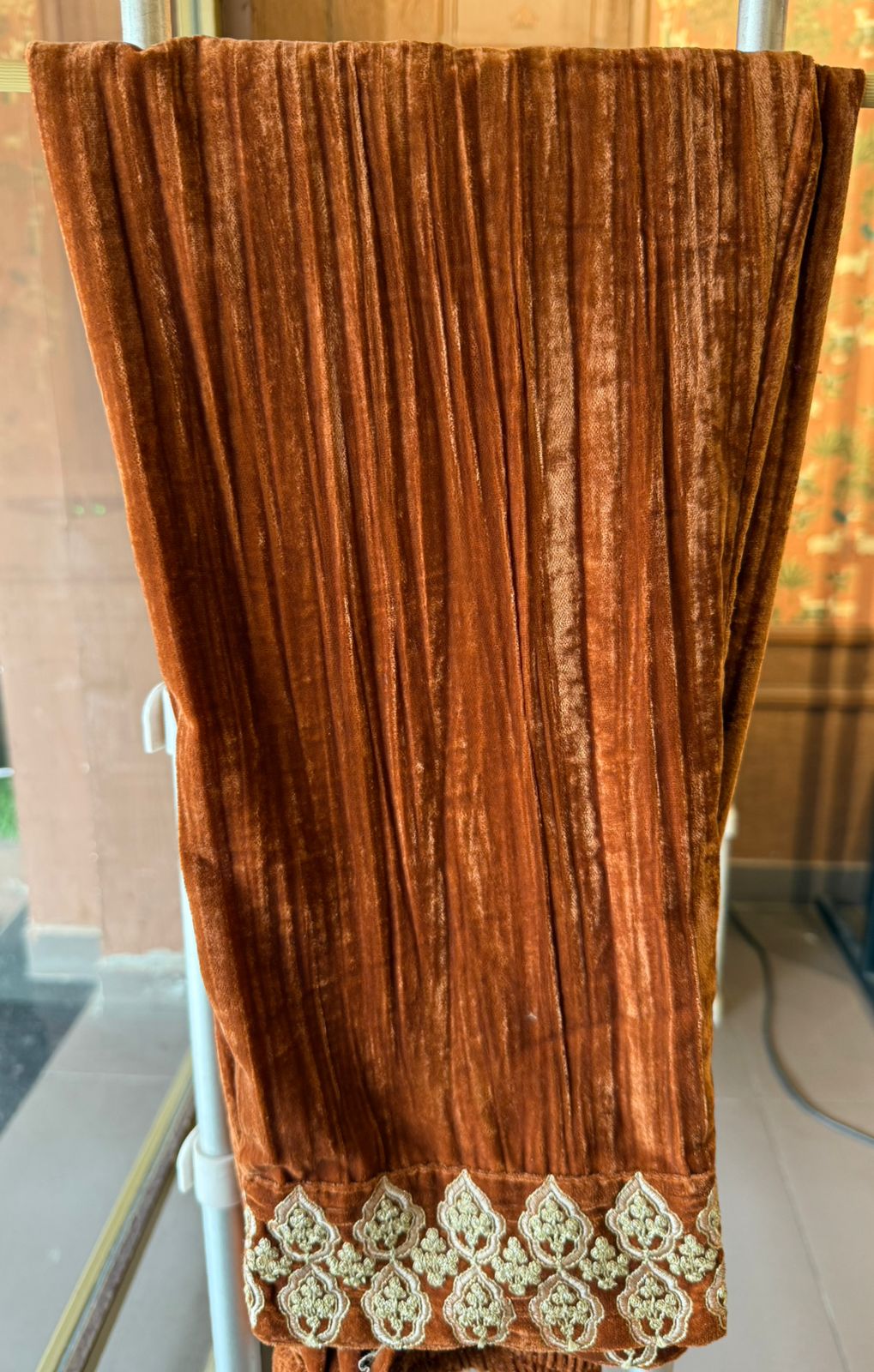 Crushed velvet bottoms with Zari embroidered border.