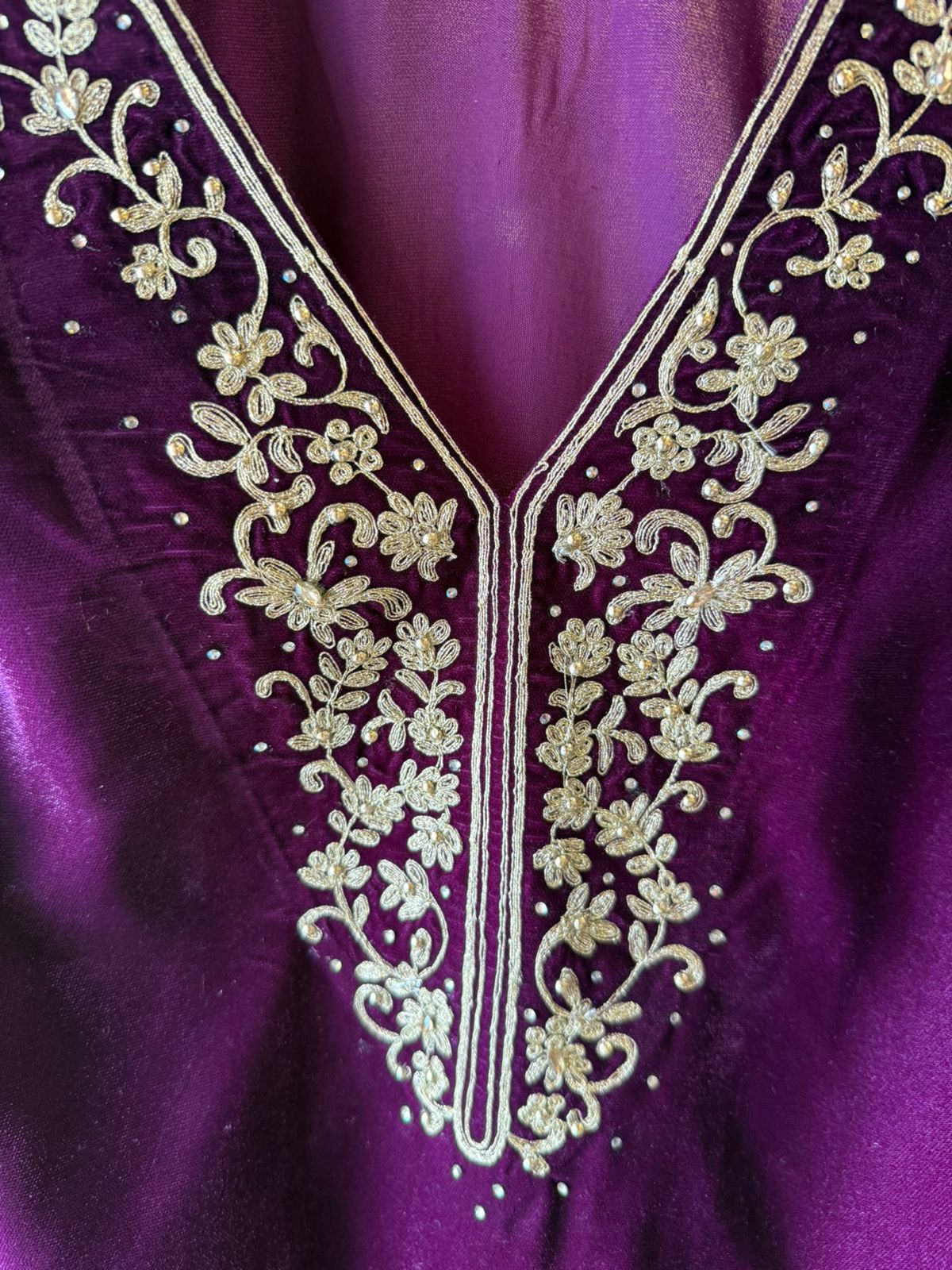 Heavy zari work (gold thread) around the neckline, forming an intricate floral pattern.